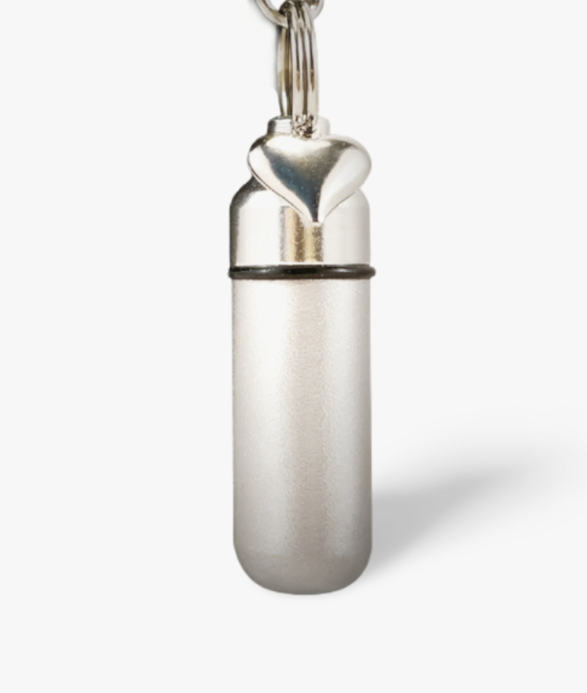 Sturdy, discreet, and secure, this Urn is 1-3/4 inches tall and has a small clear container inside to hold a small amount of your loved ones ashes. Keep them close to you always. Urn is made of aircraft-grade anodized aluminum and will last forever. The urn unscrews to reveal the storage chamber. Inside there is a clear container to keep the ashes safe and dry. A rubber gasket on the screw-on cap provides a waterproof seal. These urns are strong and lightweight enough to carry every day and fits nicely on a keyring or a necklace.