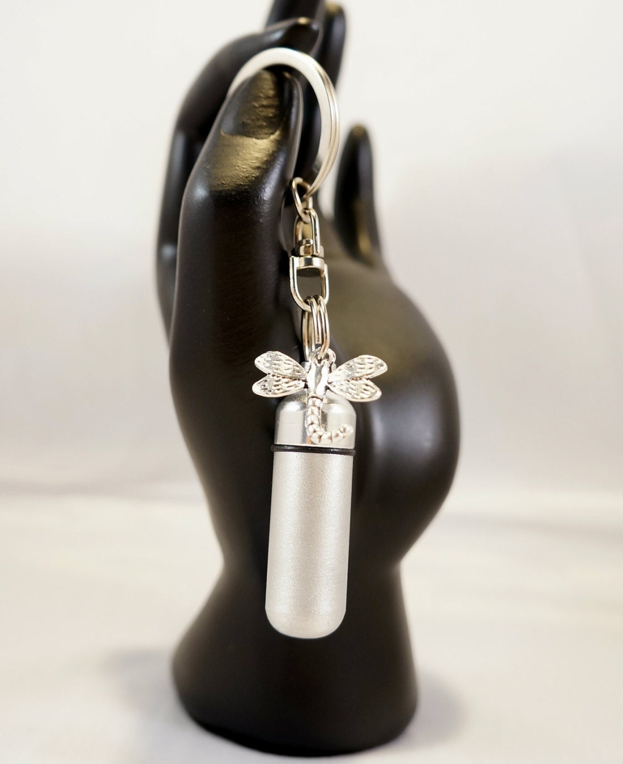 Brushed Silver Cremation Urn with DRAGONFLY Pendant on Stainless Steel Swivel Keyring - Keepsake Urn, Memorial Urn, Ashes Necklace