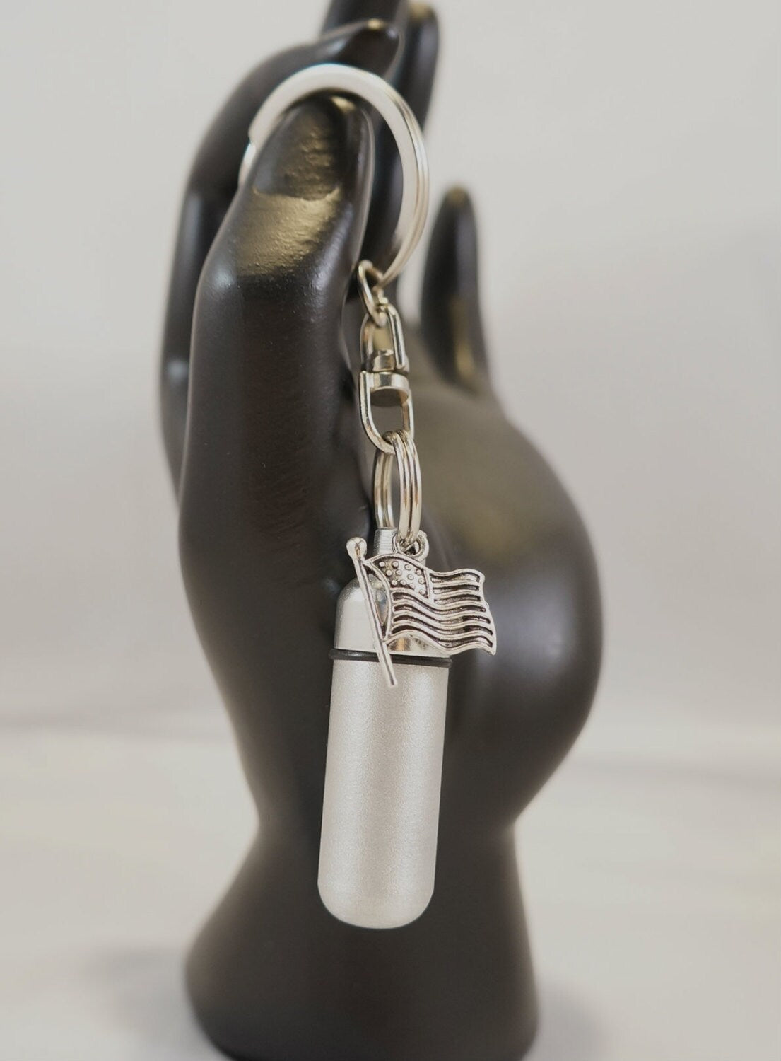 Brushed Silver Cremation Urn with USA FLAG Pendant on Stainless Steel Swivel Keyring, Hand Assembled, Custom Engravable, Urn Keepsake