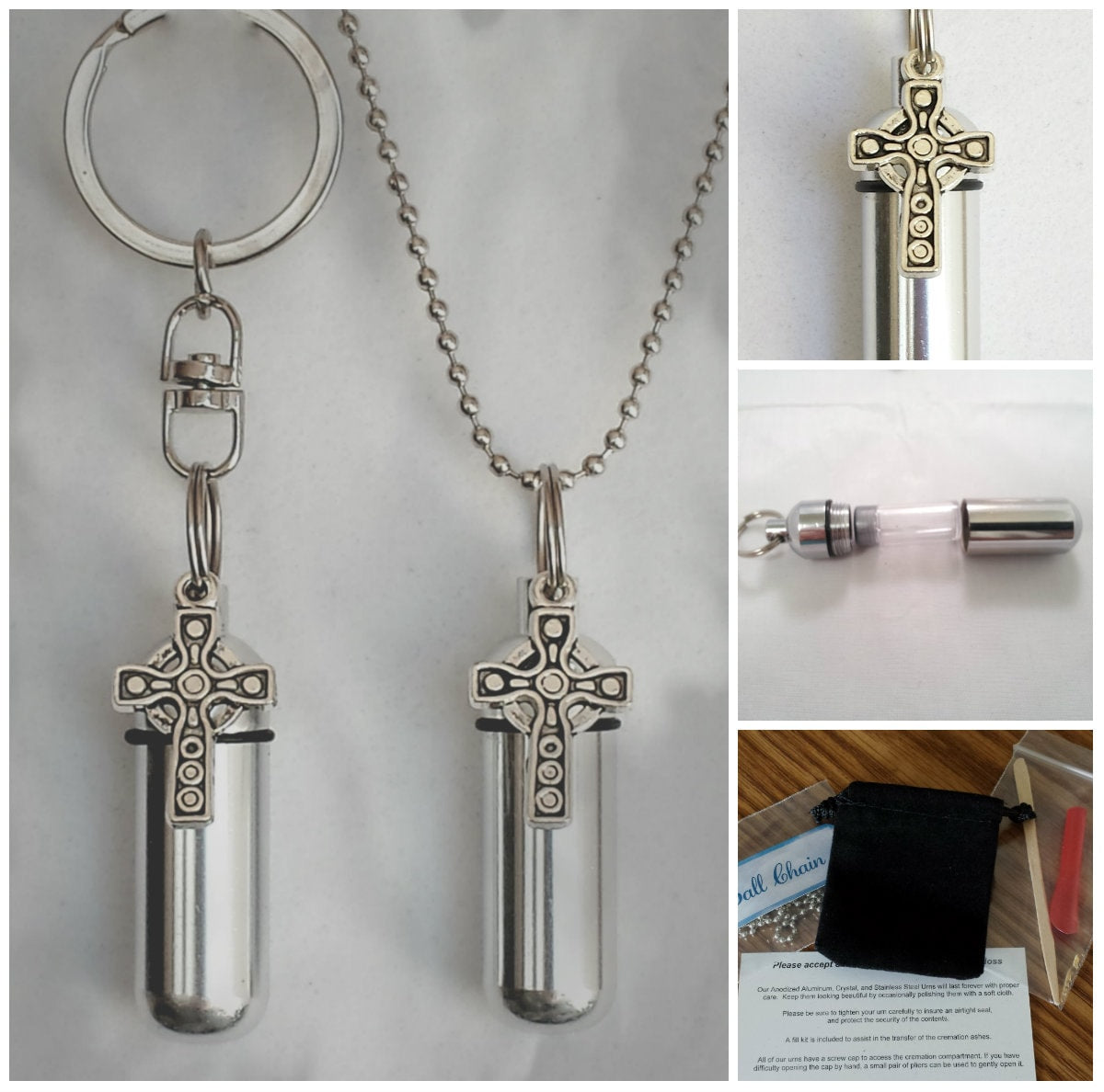 Celtic Cross 2pc. Special Set - Cremation Urn Necklace & Keychain Urn and Velvet Pouches