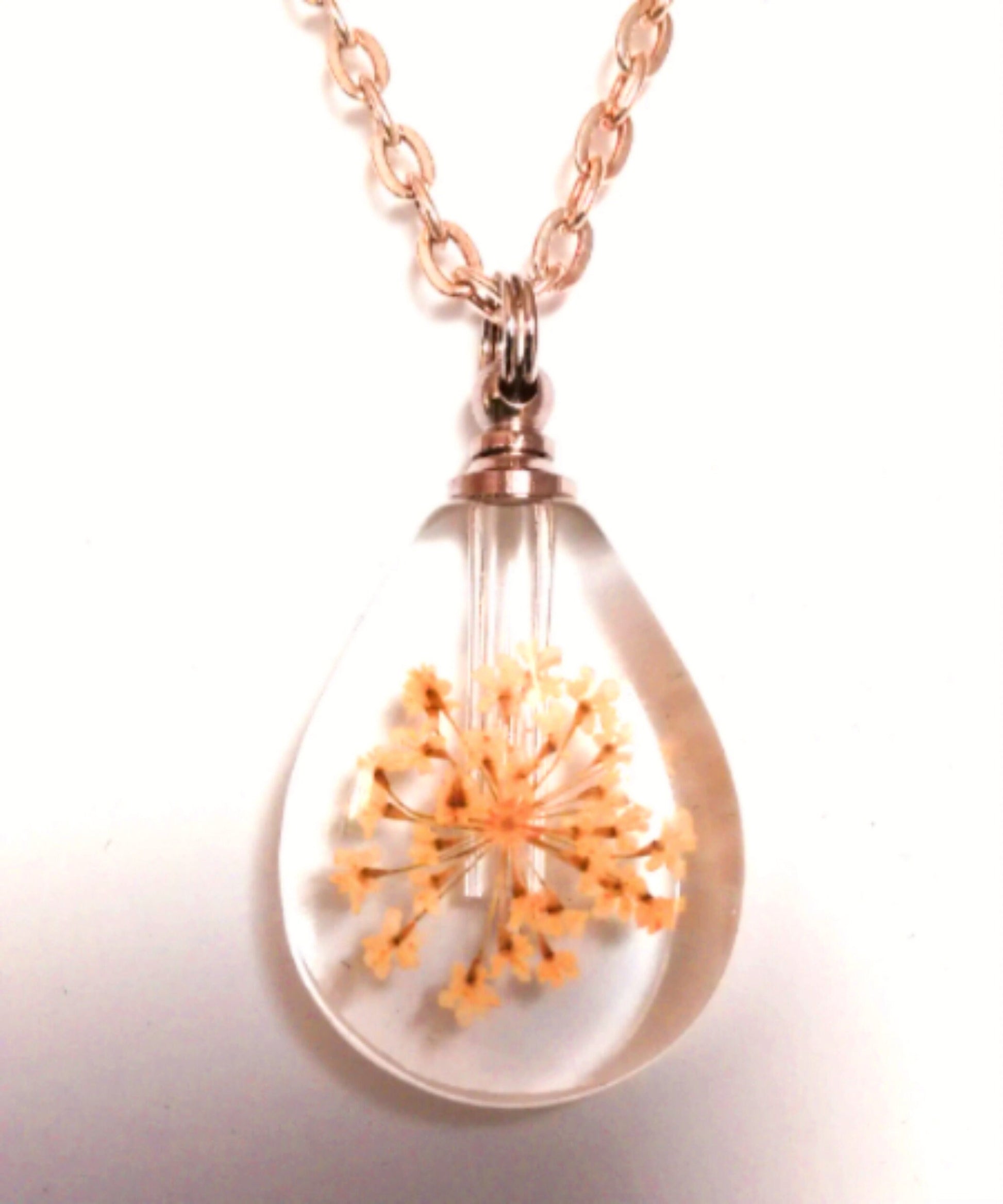 Clear Teardrop Crystal CREMATION URN NECKLACE with Embedded Dried Peach Color Flowers (each is unique) - Includes Velvet Pouch & Fill Kit