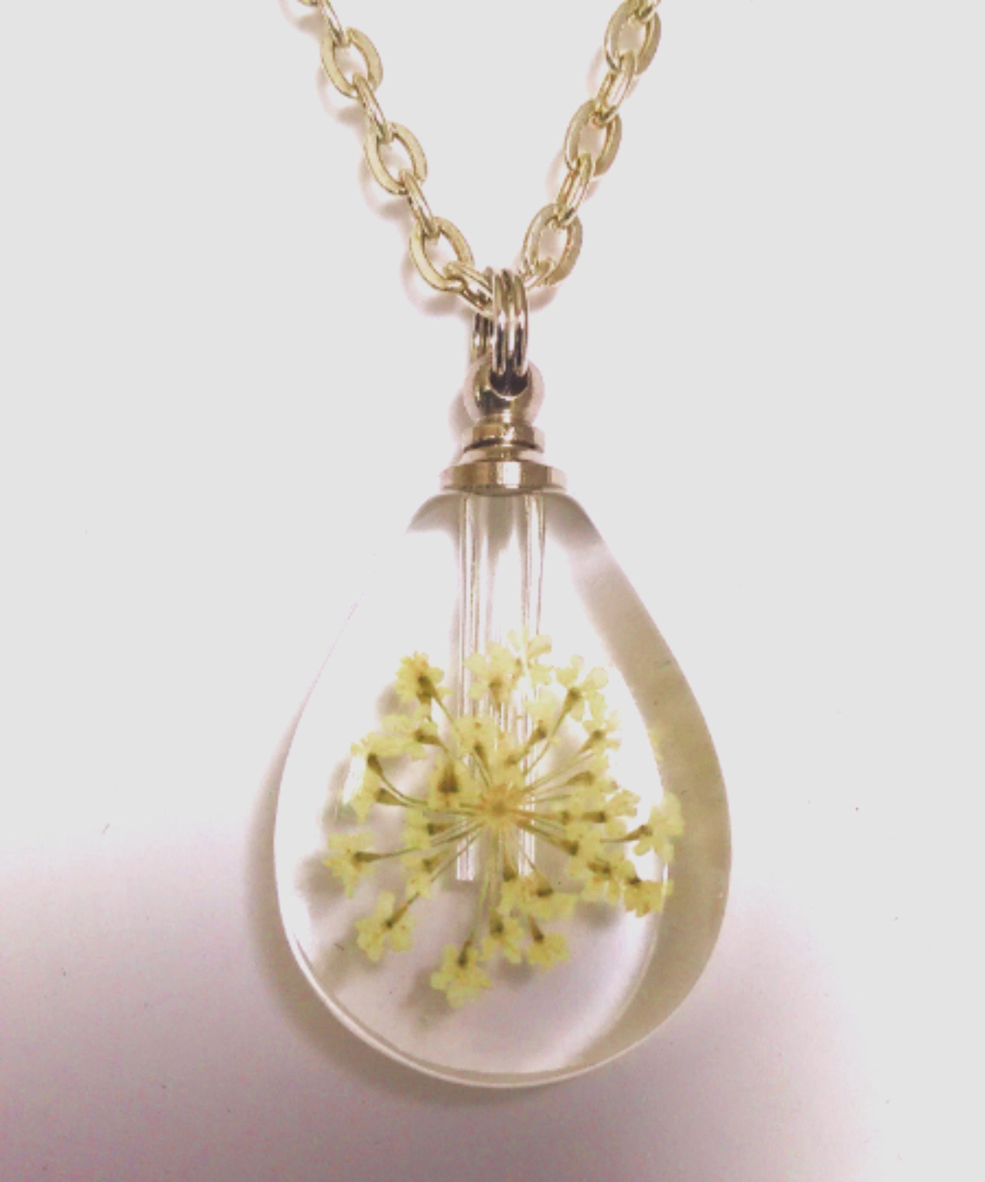 Clear Teardrop Crystal CREMATION URN NECKLACE with Embedded Dried Yellow Flowers (each one is unique) - Includes Velvet Pouch & Fill Kit
