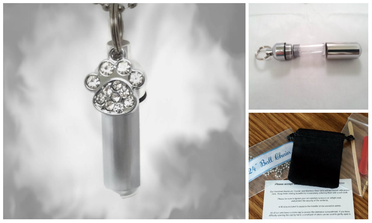 Complete CREMATION URN Set with Rhinestone PAW on 24" Necklace - Hand Assembled w/Velvet Pouch & Fill Kit - Pet Loss, Pet Urn, Dog Urn