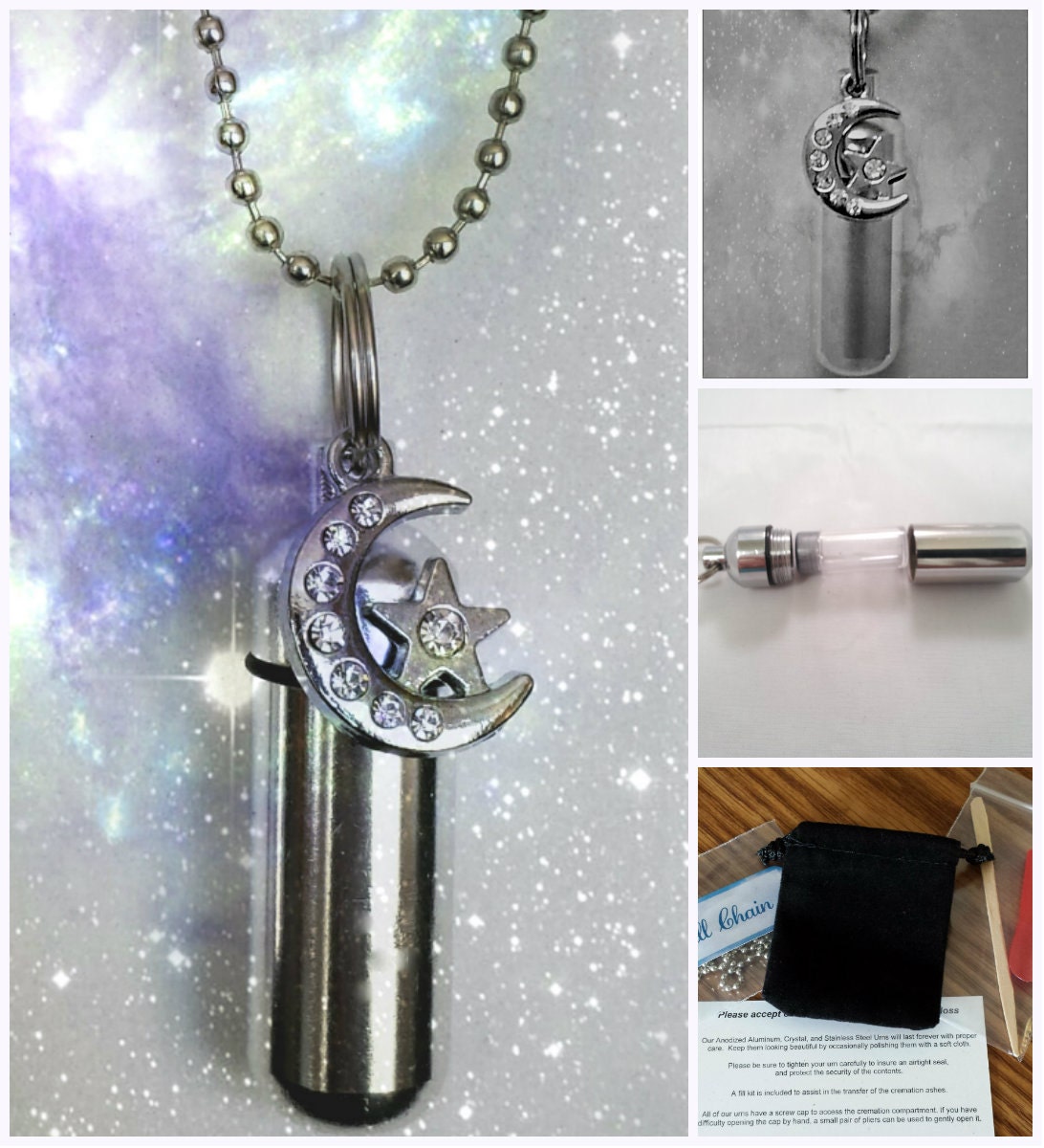 Silver Cremation Urn & container on 24" Ball Chain Necklace with Rhinestone Crescent Moon & Star