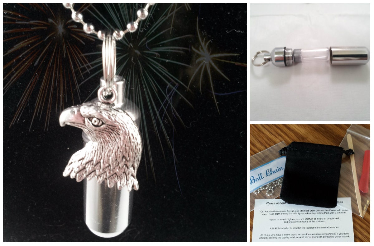 Complete Set - Silver CREMATION URN on 24" Necklace w/Patriotic Bald Eagle with Laser Engraved US Flag - Includes Pouch and Fill Kit