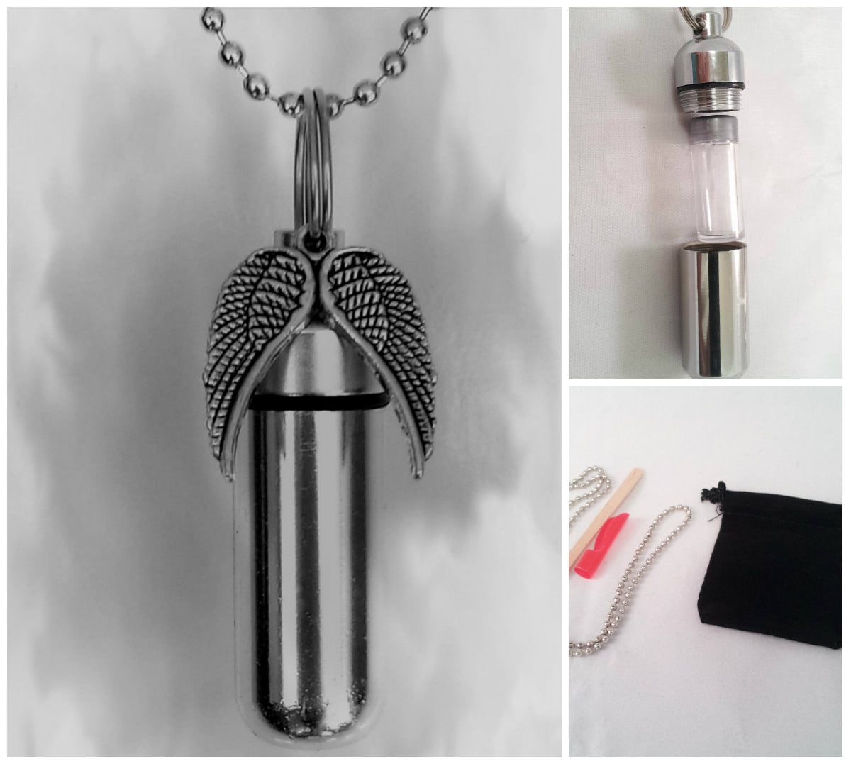 Complete Set - Spread Angel Wings Cremation Urn on 24" Necklace - Hand Assembled.... with Velvet Pouch and Fill Kit