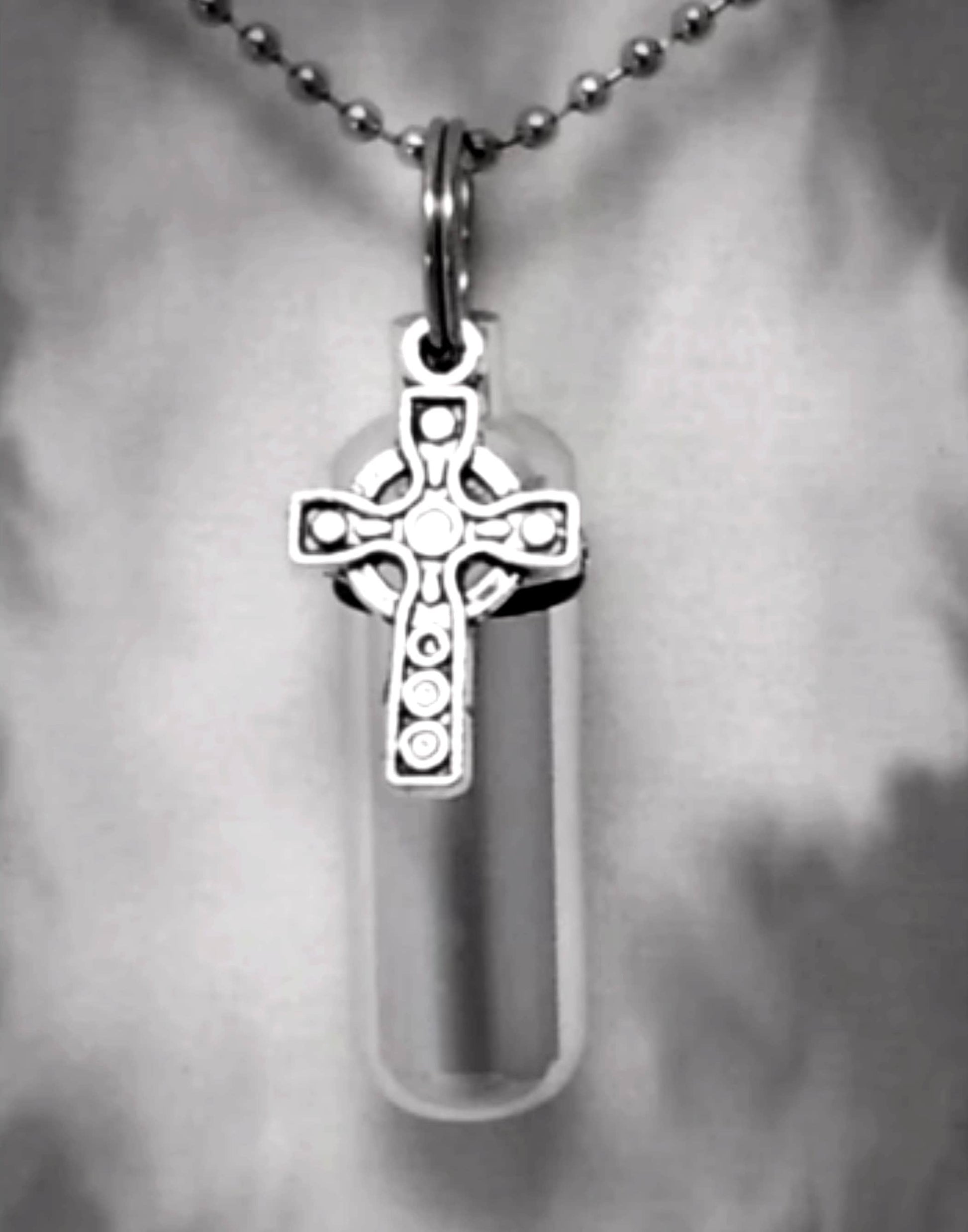 Silver Cremation Urn & container on 24" Steel Ball Chain Necklace with Universal Celtic Cross.