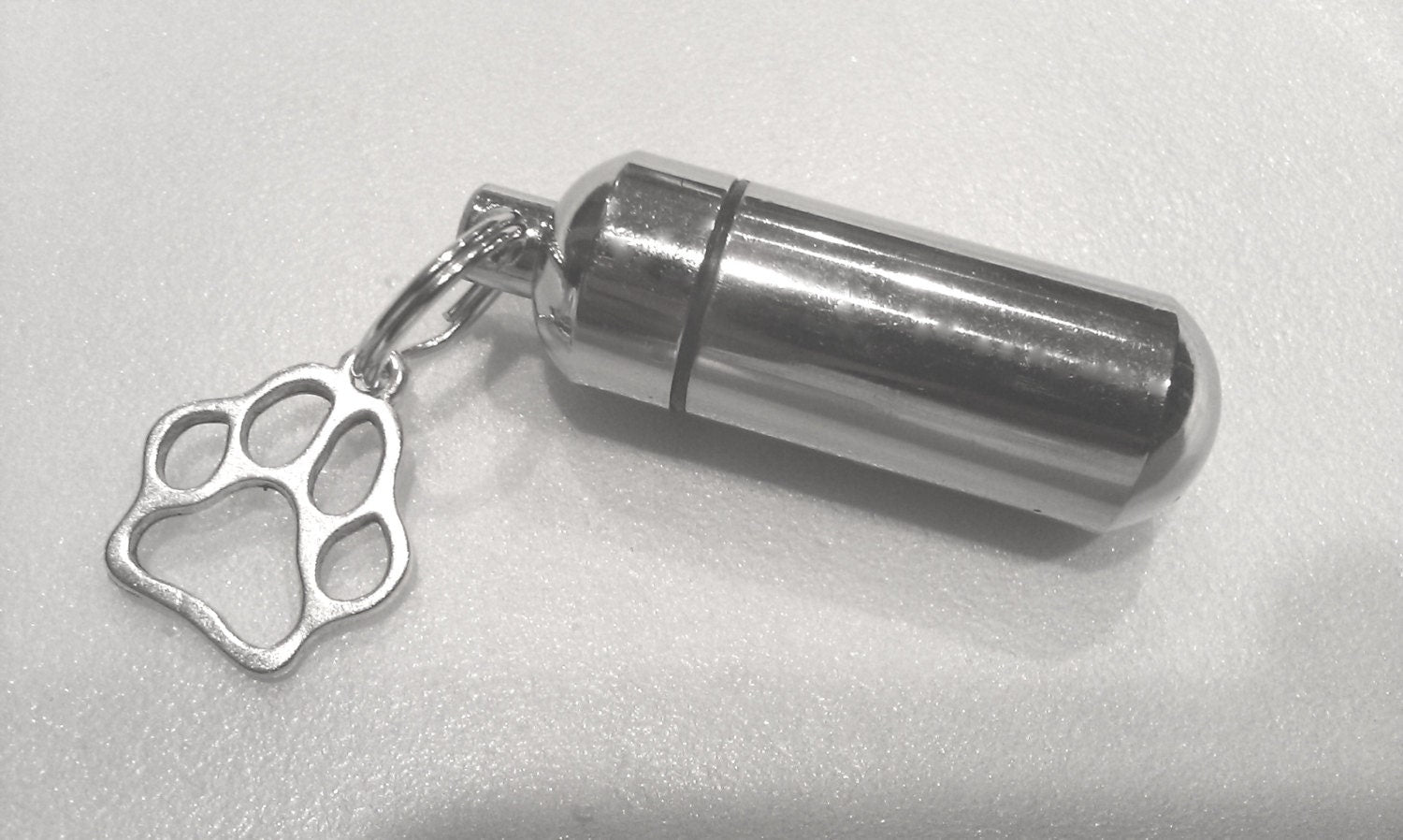A lovely Cremation Urn MEmento to keep your beloved puppy dog or other pet with you forever. Simple & discreet, wear it, hang it from a picture frame, a car mirror, or on a keychain. Each urn comes in an individual black Velvet Pouch with Fill-Kit, and 24" Necklace