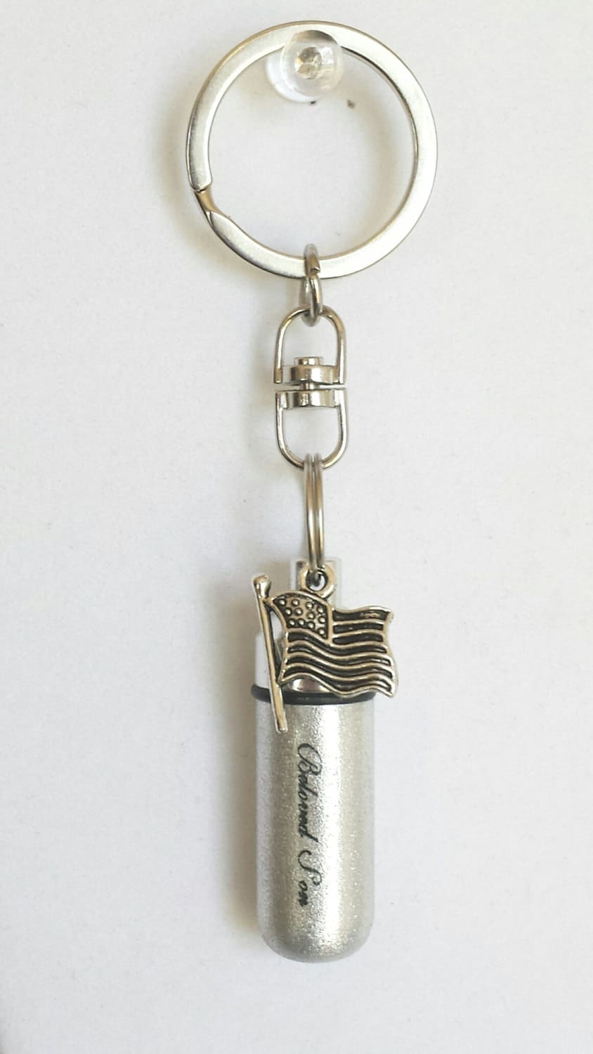 Engraved "Beloved Son" Silver Flag Cremation Urn Keychain - Hand Assembled with Velvet Pouch and Fill Kit, Ashes Keepsake, Mourning Jewelry