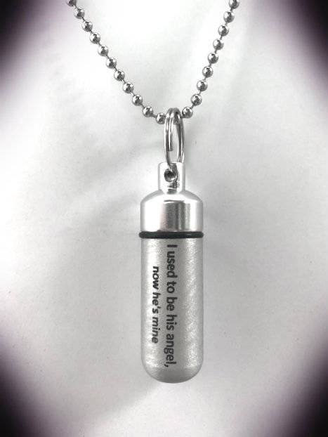 ENGRAVED Brushed Silver CREMATION URN Necklace "I used to be his angel, now he's mine" - Includes Velvet Pouch, Ball Chain & Fill-Kit