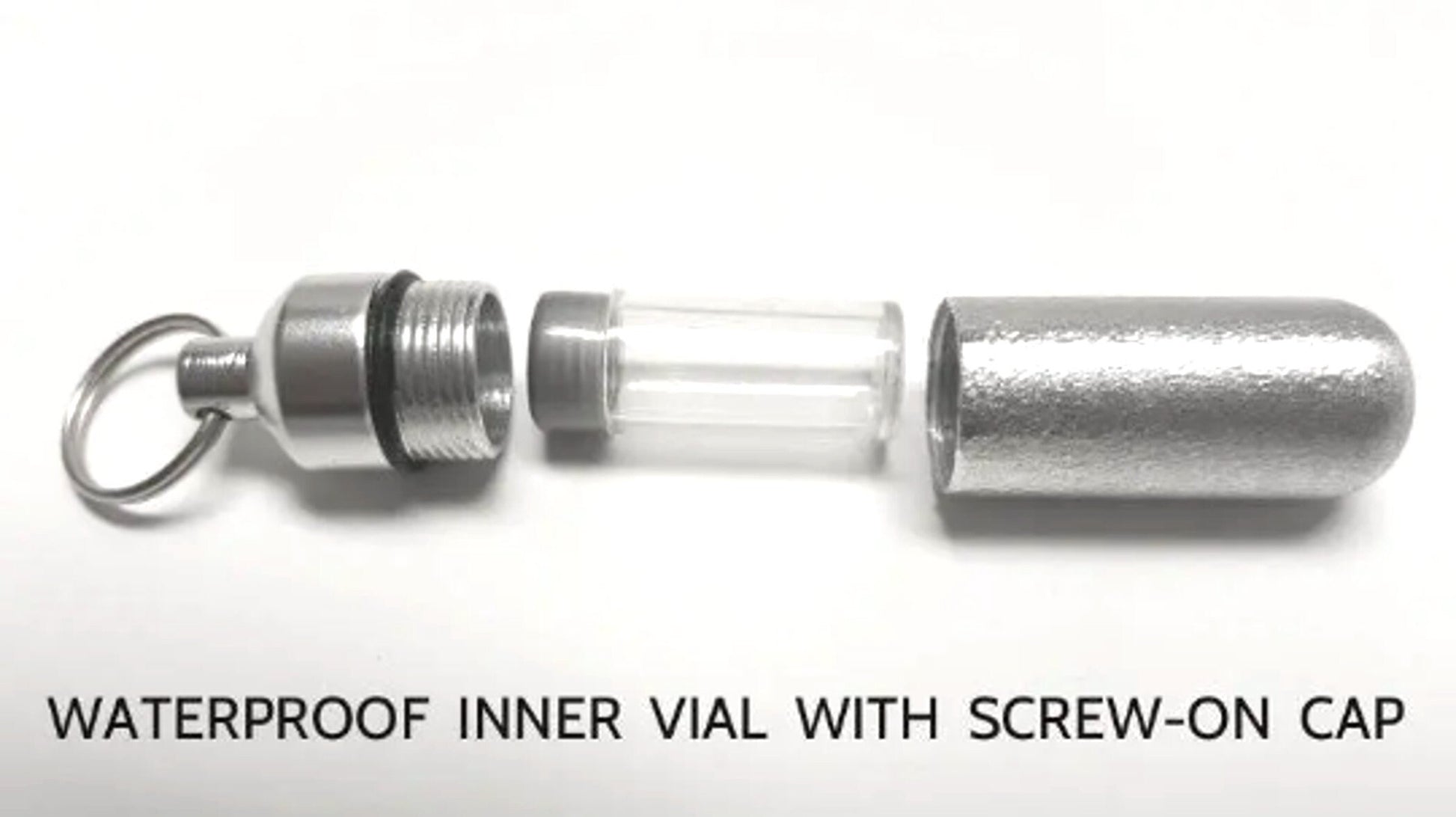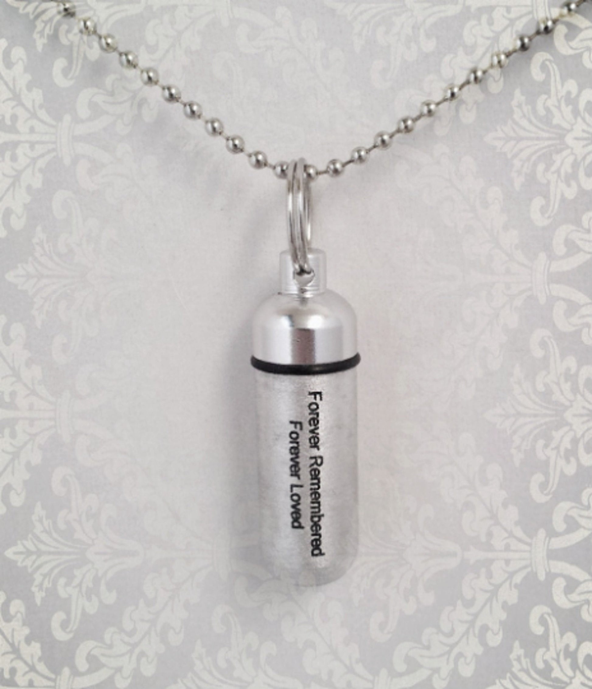 Sturdy, discreet, and secure, this Urn is 1-3/4 inches tall and has a small clear container inside to hold a small amount of your loved ones ashes. Keep them close to you always. Urn is made of aircraft-grade anodized aluminum and will last forever. The urn unscrews to reveal the storage chamber. Inside there is a clear container to keep the ashes safe and dry. A rubber gasket on the screw-on cap provides a waterproof seal. These urns are strong and lightweight enough to carry every day and fits nicely on a keyring or a necklace.