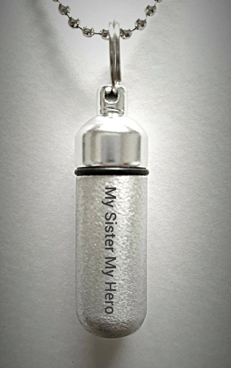 Engraved "My Sister My Hero" Brushed Silver CREMATION URN Necklace - Hand Crafted - with Velvet Pouch and Fill Kit