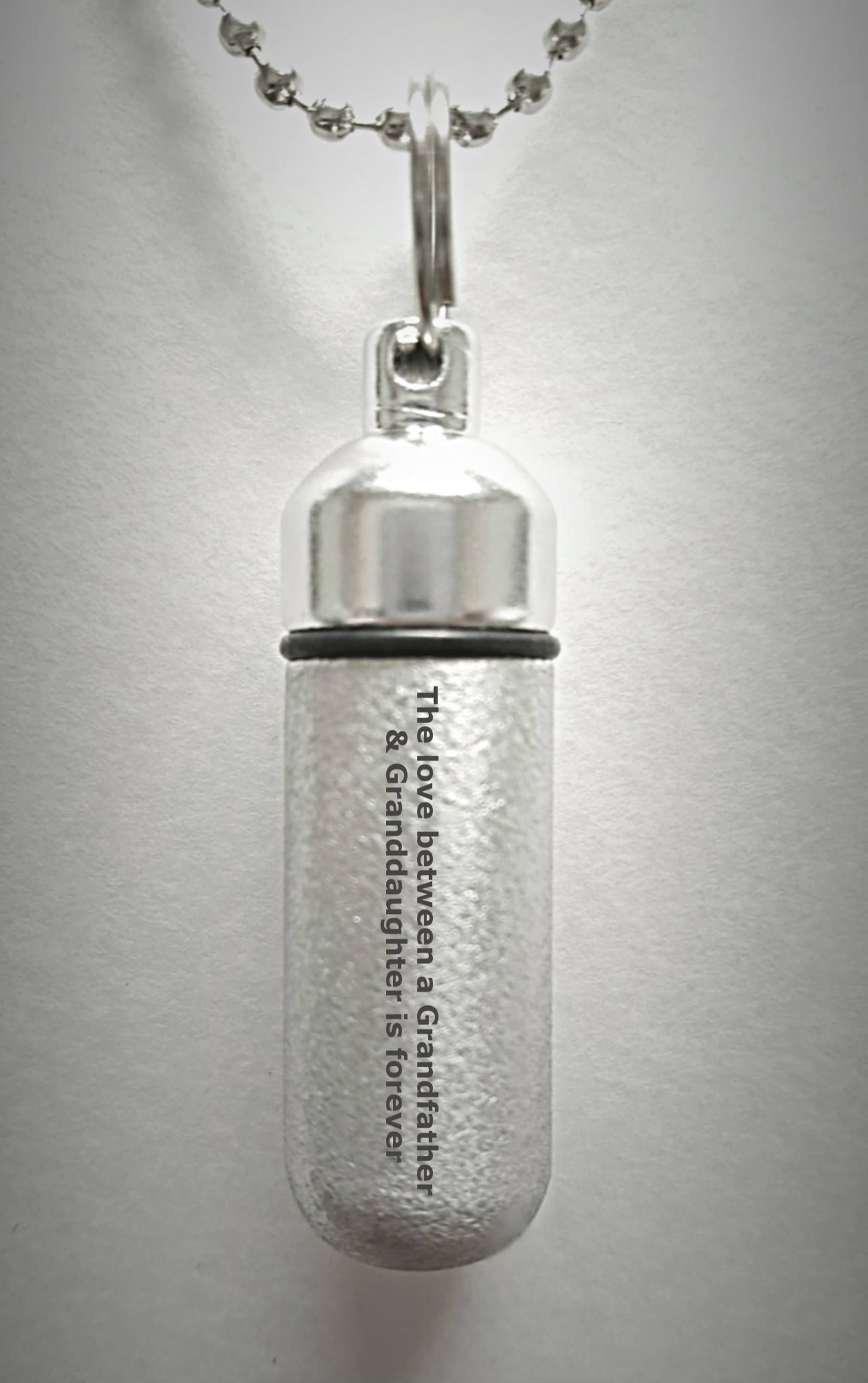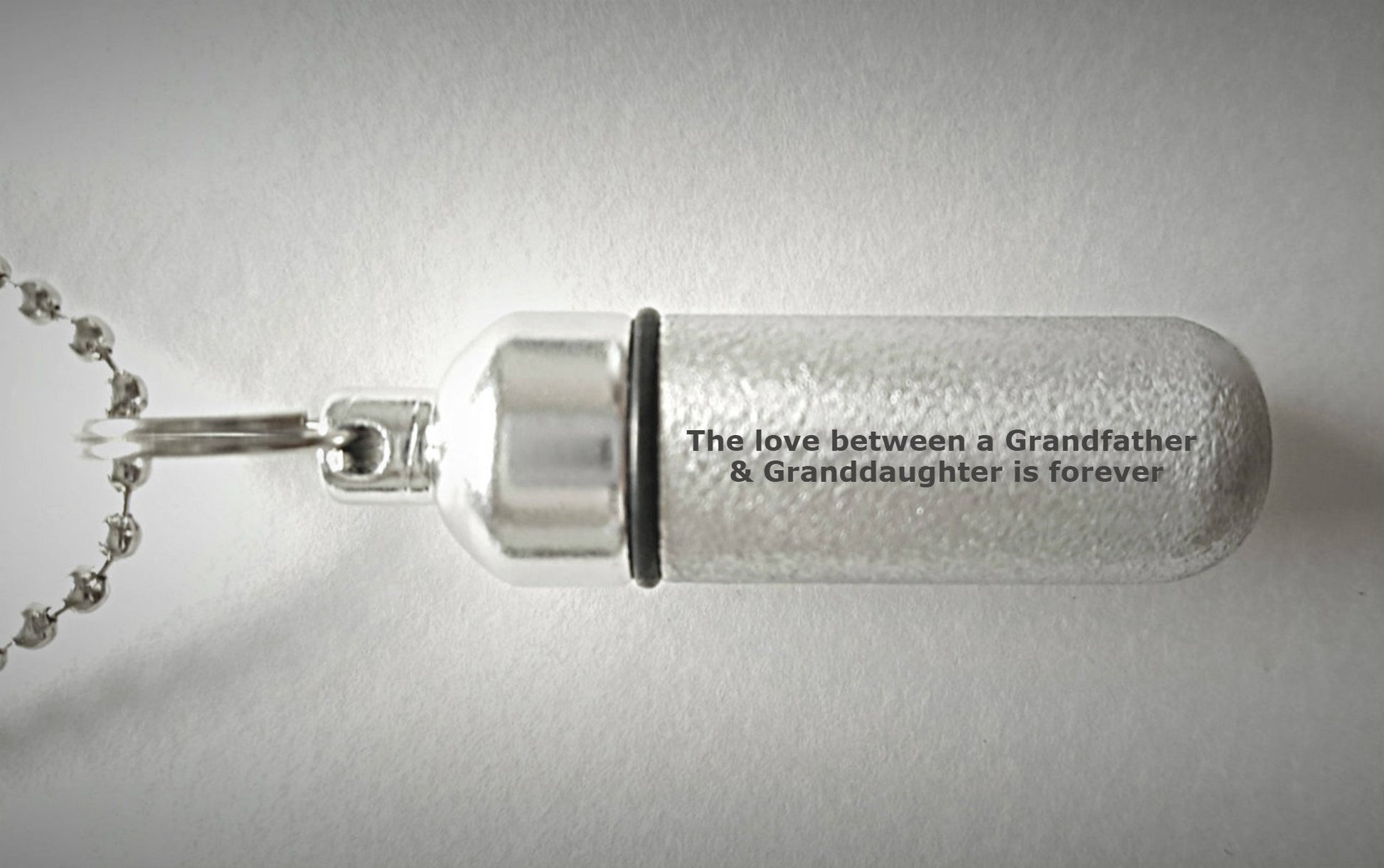 Engraved "The love between a Grandfather & Granddaughter is forever" Brushed Silver CREMATION URN Necklace with Velvet Pouch and Fill Kit