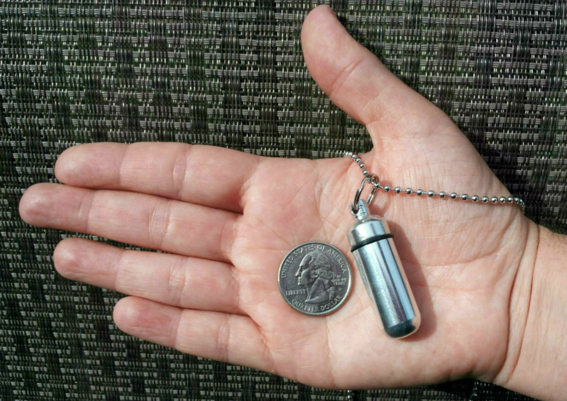 Sturdy, discreet, and secure, this Urn is 1 3/4 inches tall and has a small clear container inside to hold a small amount of your loved ones ashes. Keep them close to you always. Urn is made of aircraft-grade Anodized Aluminum and will last forever. The urn unscrews to reveal the storage chamber. Inside there is a clear container to keep the ashes safe and dry. A rubber gasket on the screw-on cap provides a waterproof seal. This urns is strong and lightweight enough to carry every day and fits nicely on a keyring or a necklace.