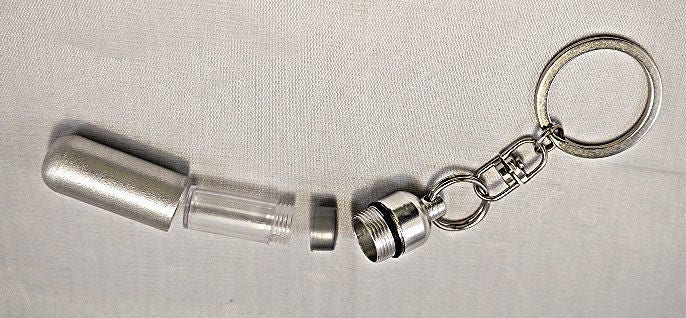 Sturdy, discreet, and secure, this Urn is 1-3/4 inches tall and has a small clear container inside to hold a small amount of your loved ones ashes. Keep them close to you always. Urn is made of aircraft-grade anodized aluminum and will last forever. The urn unscrews to reveal the storage chamber. Inside there is a clear container to keep the ashes safe and dry. A rubber gasket on the screw-on cap provides a waterproof seal. These urns are strong and lightweight enough to carry every day and fits nicely on a keyring or a necklace.