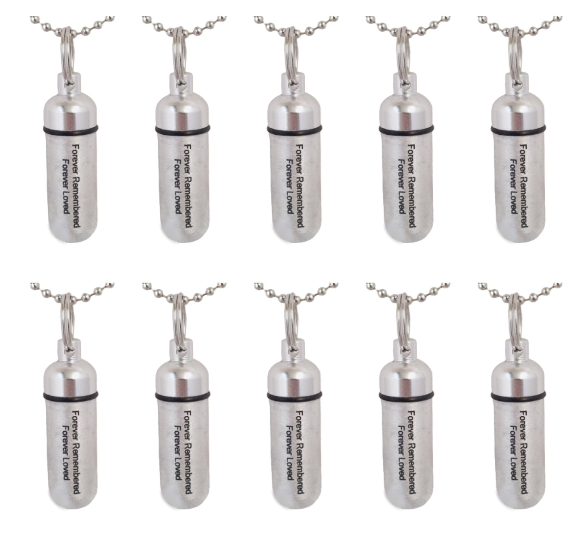 YOU GET TEN CREMATION URN NECKLACE KEEPSAKES, TEN VELVET POUCHES, FILL KIT, AND TEN 24" STEEL BALL CHAINS.