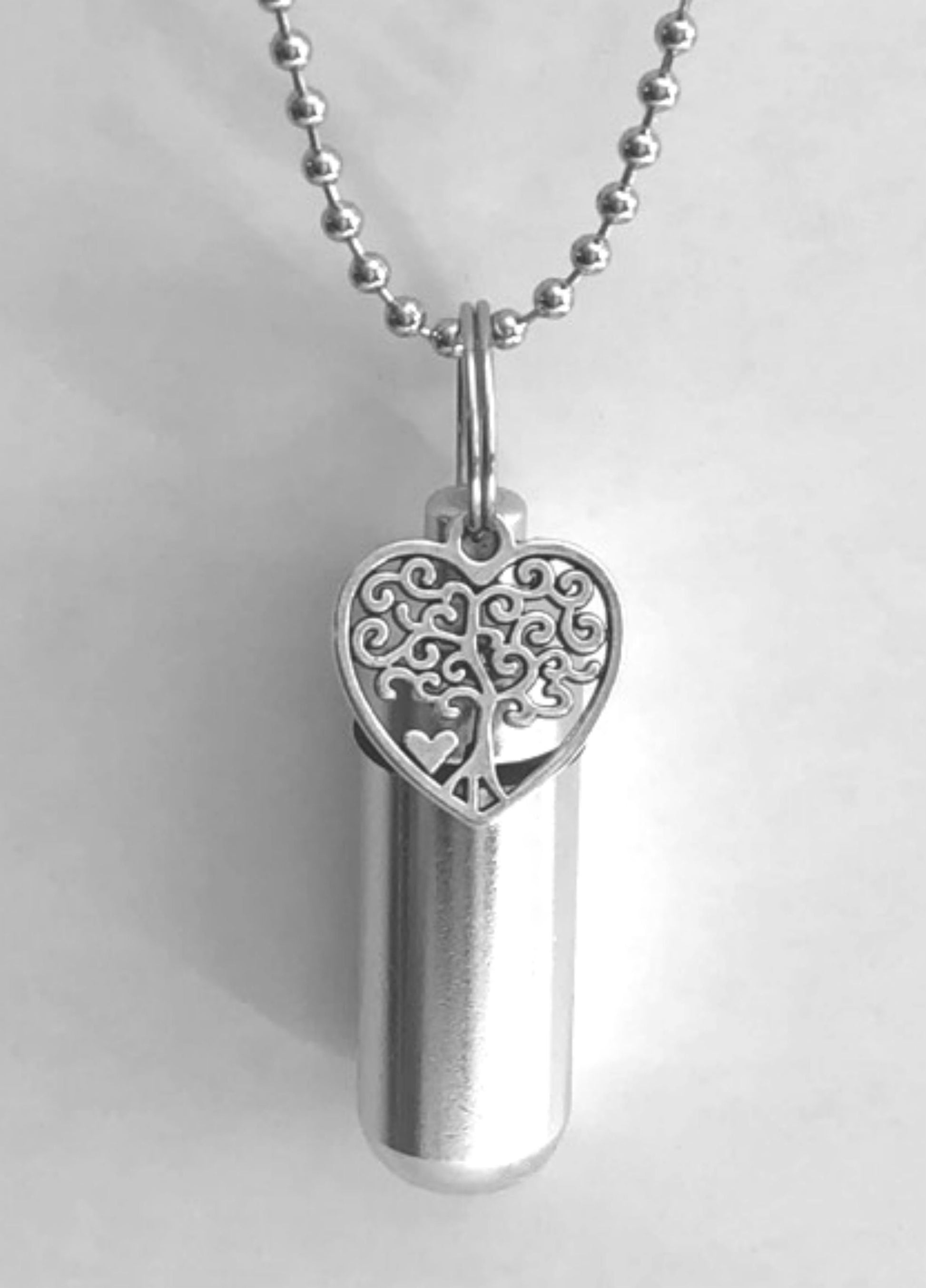Silver Cremation Urn & container on 24" Ball-Chain NECKLACE with Silver Tree Of Life Heart Charm