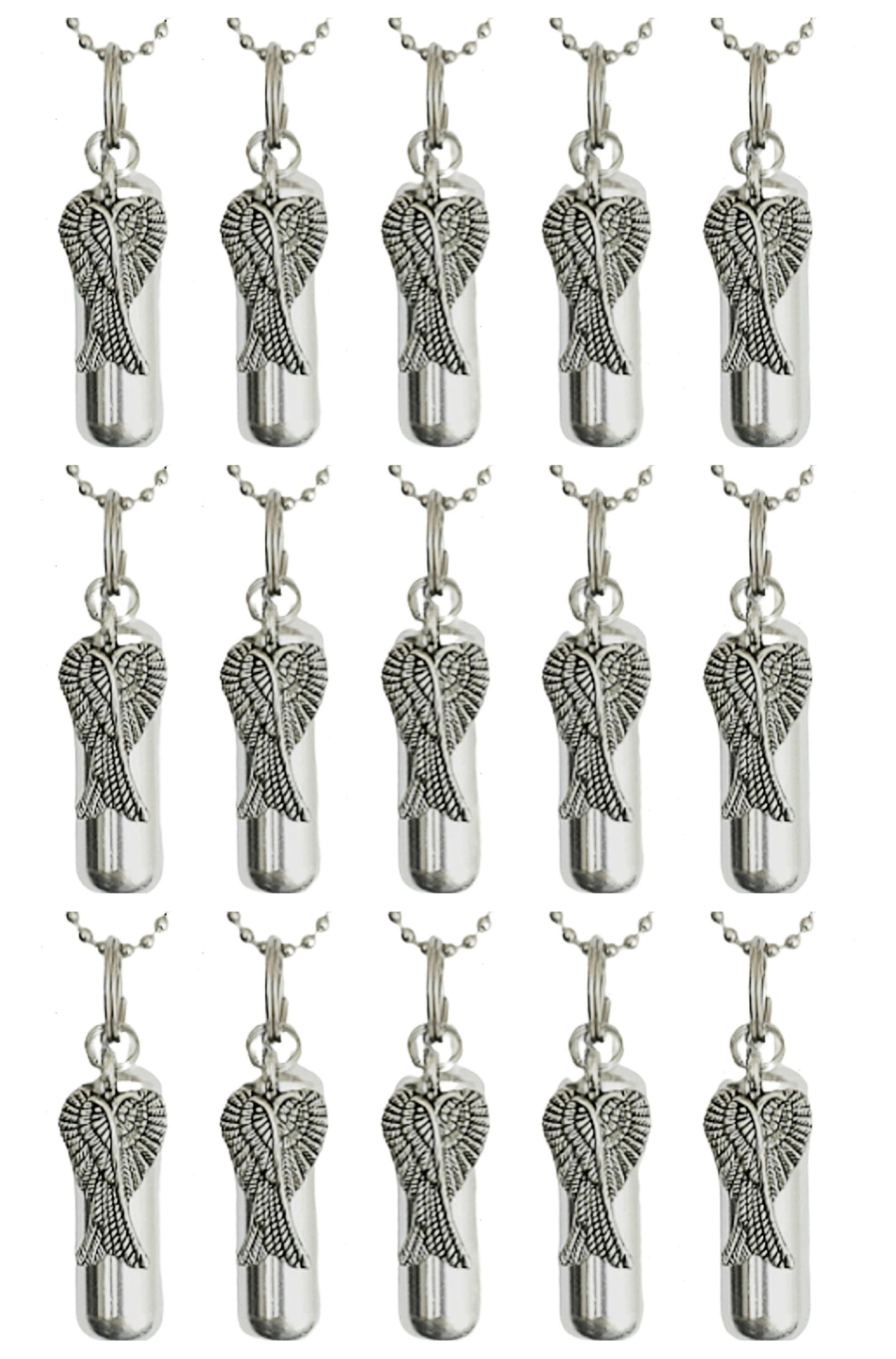 15 Silver Cremation Urn & container on 24" Necklaces with Crossed Angel Wings