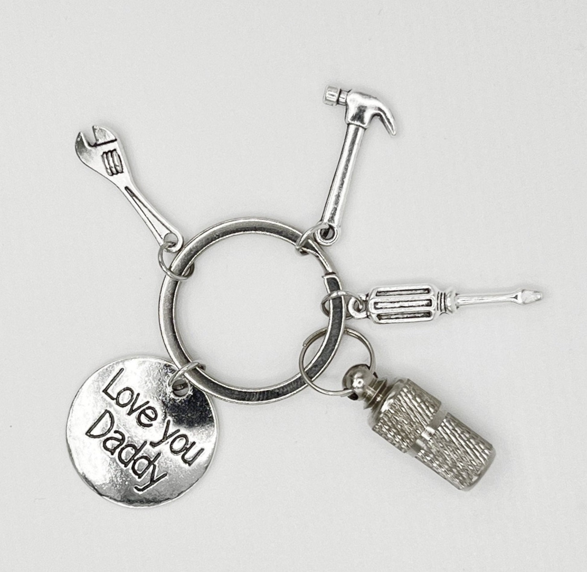 LOVE YOU DADDY - Mini Cremation Urn on Stainless Steel Keyring with Tool Charms (as shown) - Includes Fill Kit and Velvet Pouch