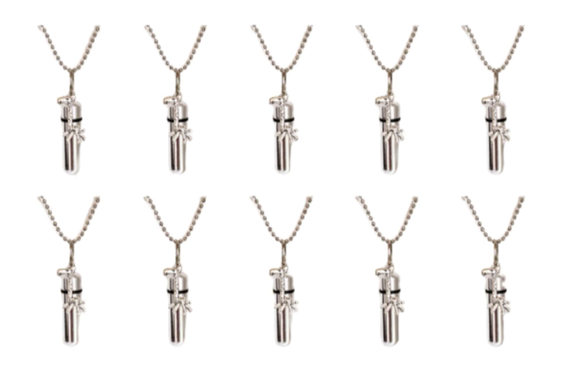 YOU GET TEN GIRAFFE CREMATION URN KEEPSAKE NECKLACES, TEN VELVET POUCHES, TEN 24" STEEL BALL CHAINS & FILL KIT.