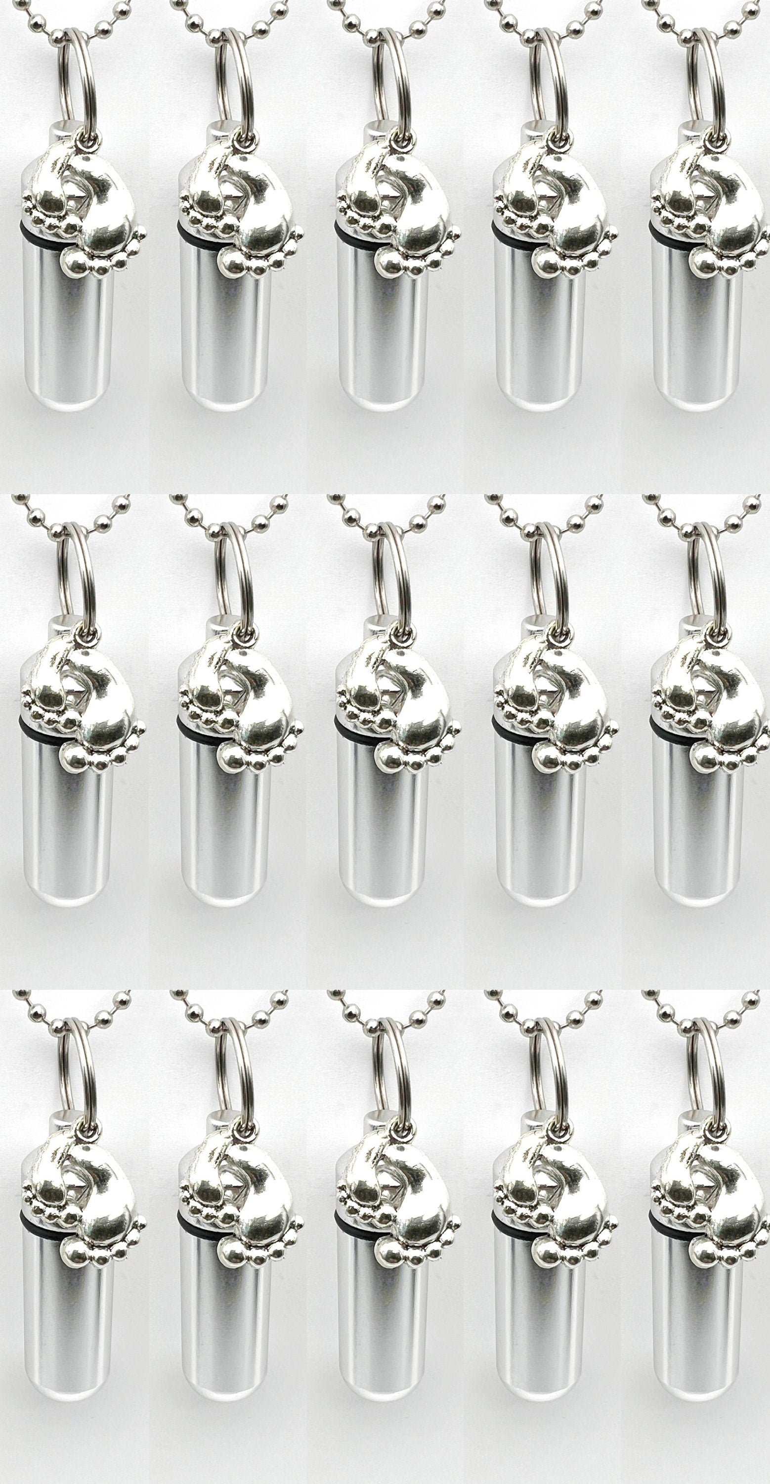 SET OF FIFTEEN: Silver Baby Feet Cremation Urns & containers on FIFTEEN 24" Ball Chain Necklaces. Comes complete with 15 Velvet Pouches and Fill Kit.