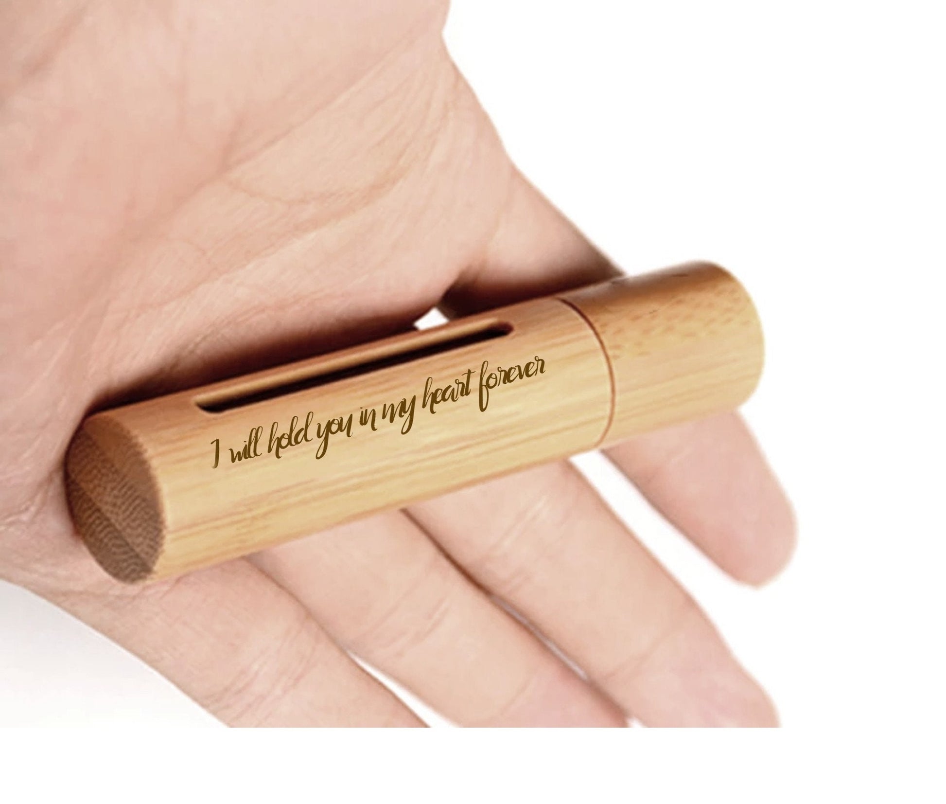 New ENGRAVED "I will hold you in my heart forever" Sandalwood Cremation Urn / Scattering Tube w/Window - Fits Pocket or Purse, TSA Compliant