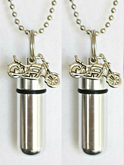 Pair of Silver MOTORCYCLE CREMATION URN Necklaces with Laser Engraved American Flags - Mourning Jewelry, Urn Necklace, Pet Urn, Ashes Urn