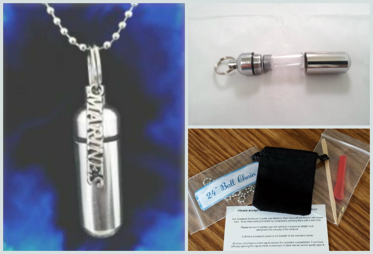 Patriotic MARINES Cremation Urn on 24" Ball Chain Necklace, Hand Assembled w/Velvet Pouch & Fill Kit - Custom Engravable, Military Keepsake