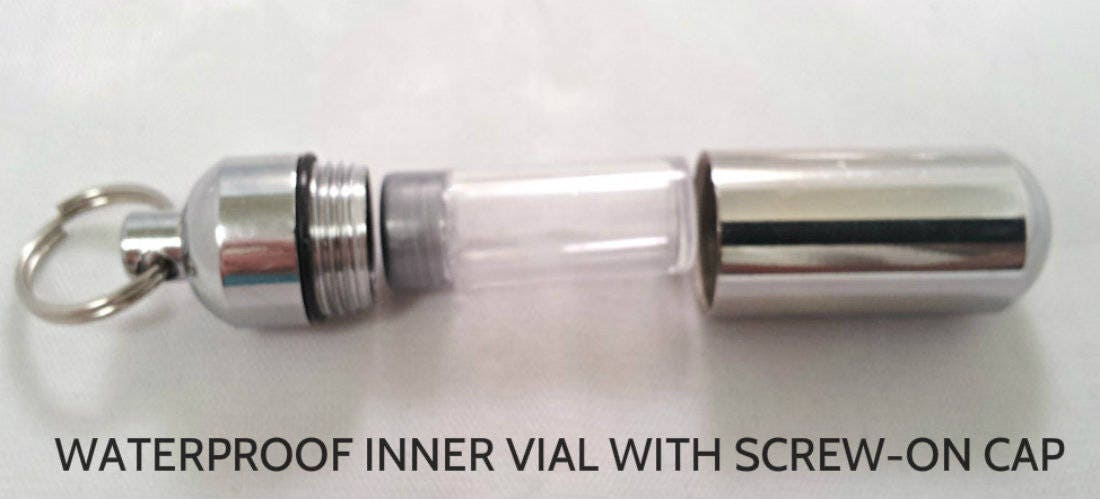 Sturdy, discreet, and secure, this Urn is 1-3/4 inches tall and has a small clear container inside to hold a small amount of your loved ones ashes. Keep them close to you always. Urn is made of aircraft-grade anodized aluminum and will last forever. The urn unscrews to reveal the storage chamber. Inside there is a clear container to keep the ashes safe and dry. A rubber gasket on the screw-on cap provides a waterproof seal. These urns are strong and lightweight enough to carry every day and fits nicely on a keyring or a necklace.