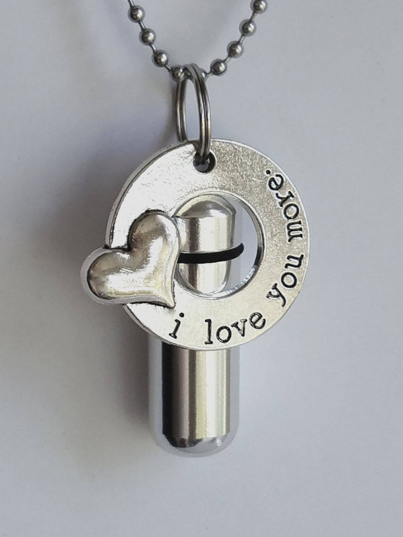 Personal CREMATION URN NECKLACE with "I love you more" Charm Ring - with Velvet Pouch, 24" Steel Ball Chain, Fill Kit, Ashes Keepsake