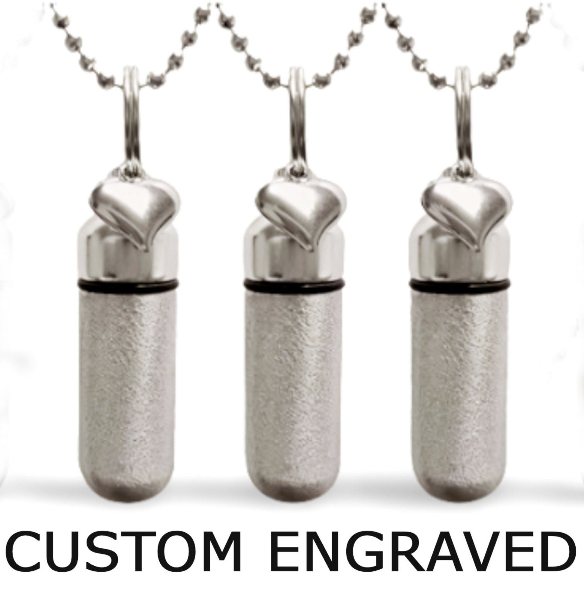 YOU GET THREE LASER ENGRAVED PUFFED HEART CREMATION URN KEEPSAKES, THREE VELVET POUCHES, FILL KIT, AND THREE 24" STEEL BALL CHAINS.
