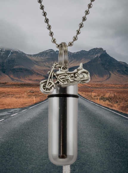 Silver MOTORCYCLE CREMATION URN Necklace on 24" Ball Chain - Includes Velvet Pouch and Fill Kit