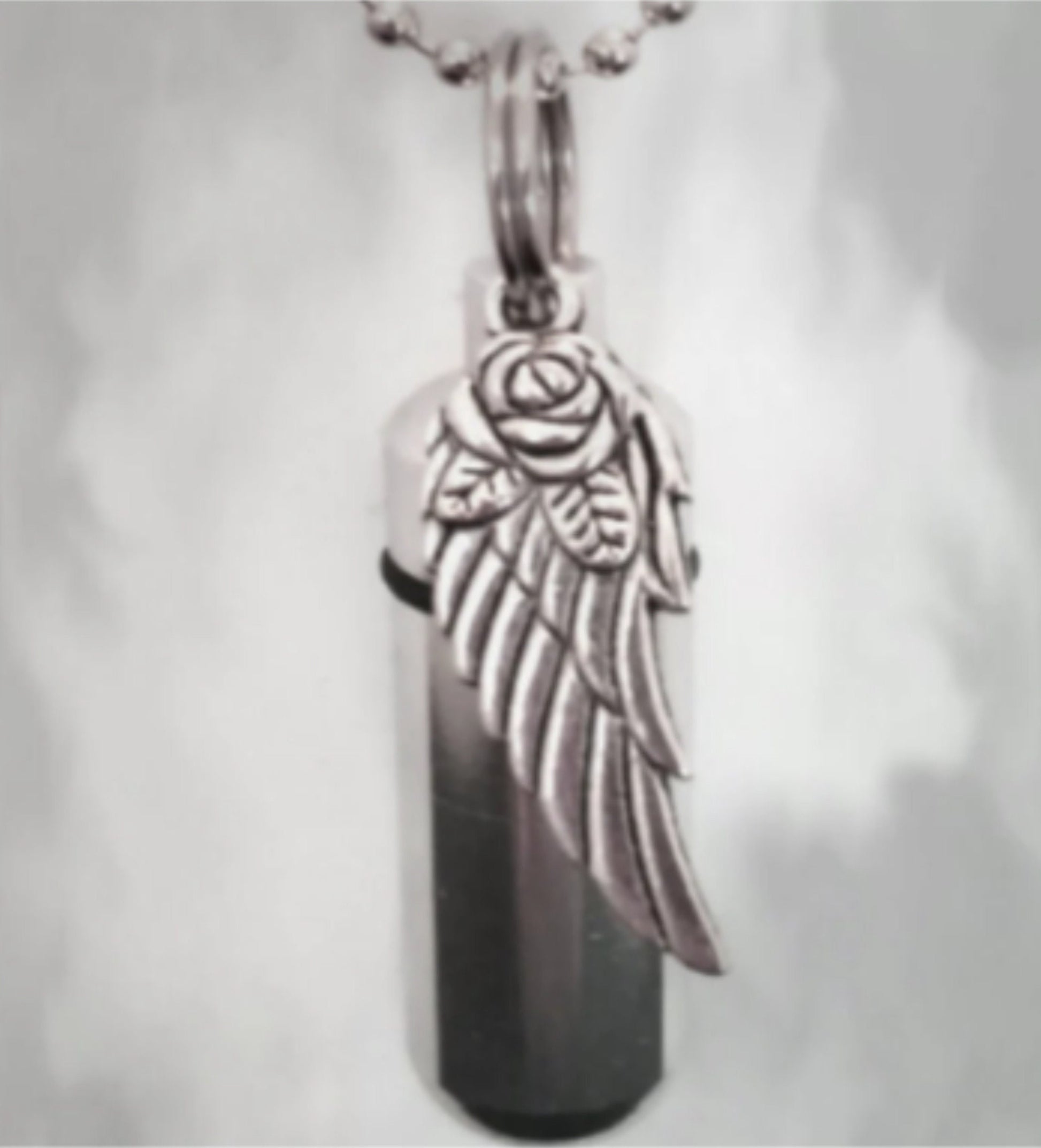 Silver Cremation Urn & container on 24" Steel Ball Chain Necklace with Wing/Rose charm