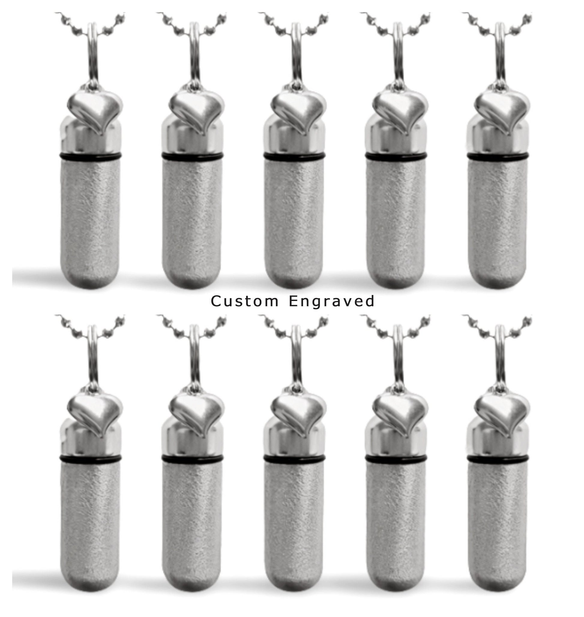 YOU GET TEN LASER ENGRAVED CREMATION URN KEEPSAKES, TEN VELVET POUCHES, FILL KIT, AND TEN 24" STEEL BALL CHAINS.