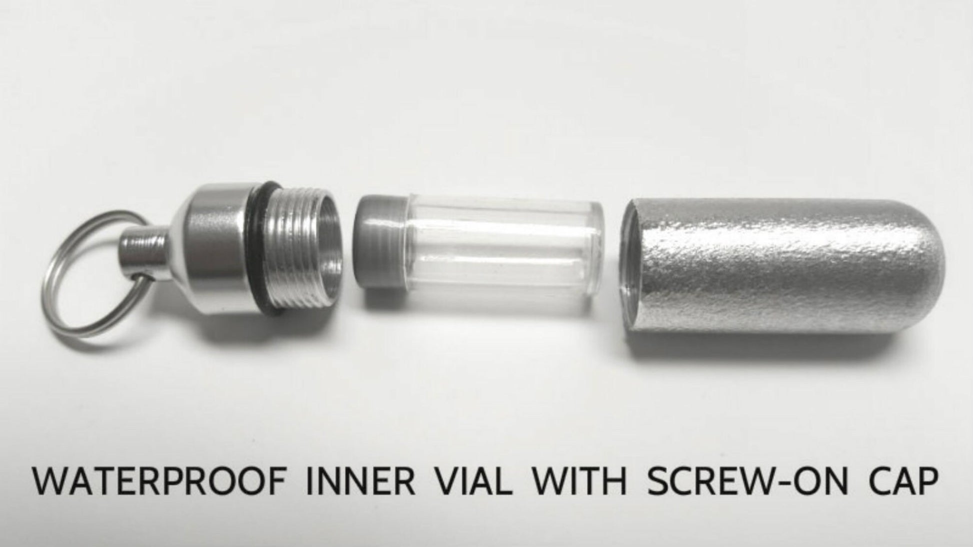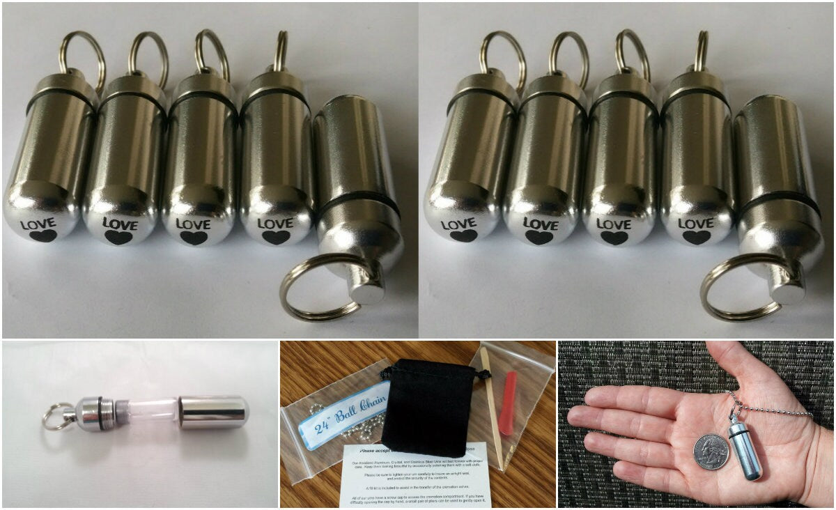 Sturdy, discreet, and secure, this Urn is 1-3/4 inches tall and has a small clear container inside to hold a small amount of your loved ones ashes. Keep them close to you always. Urn is made of aircraft-grade anodized aluminum and will last forever. The urn unscrews to reveal the storage chamber. Inside there is a clear container to keep the ashes safe and dry. A rubber gasket on the screw-on cap provides a waterproof seal. These urns are strong and lightweight enough to carry every day and fits nicely on a keyring or a necklace.