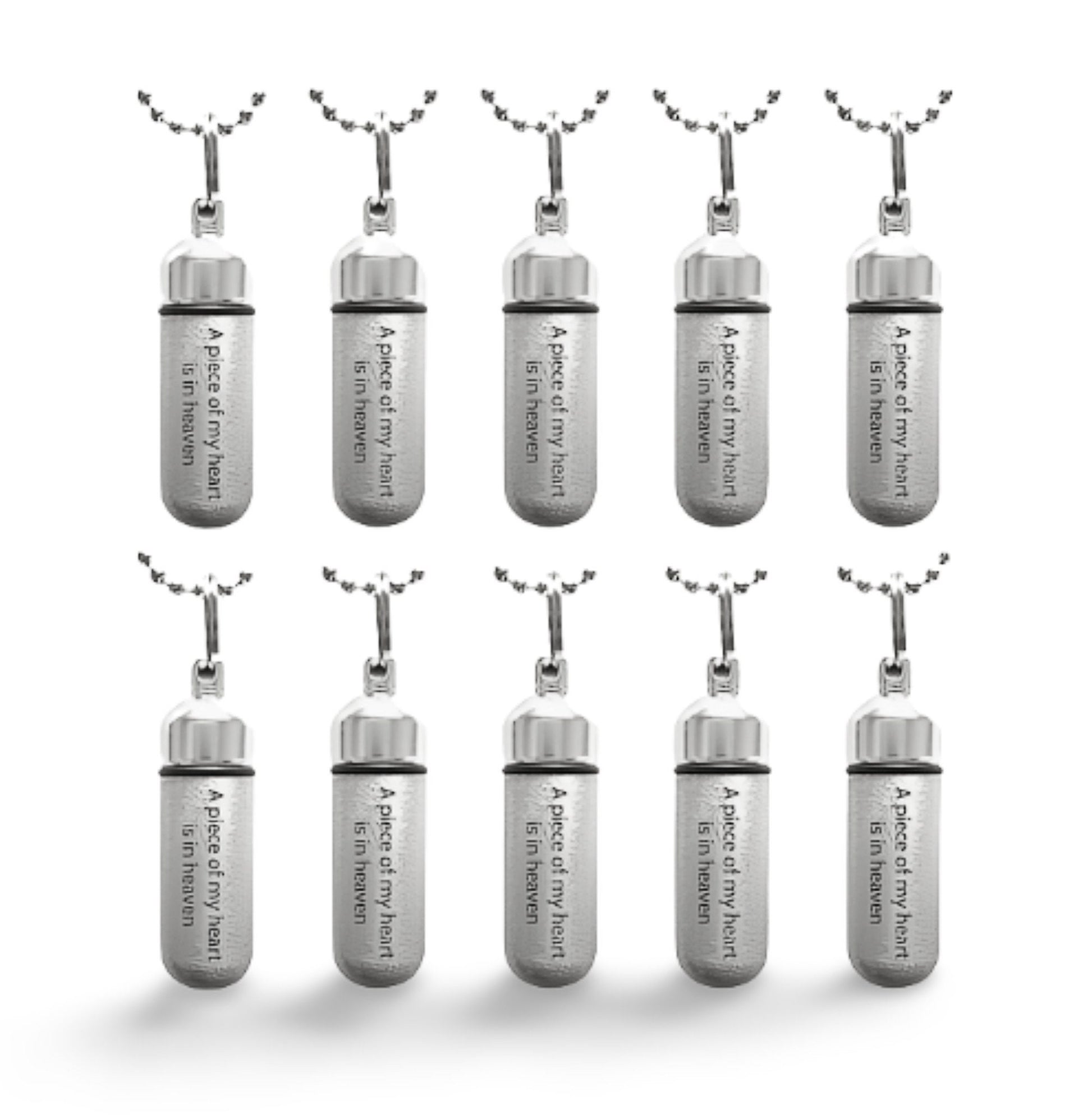Set of 10 Engraved "A piece of my heart is in heaven" Brushed Silver CREMATION URN Necklaces - Memorial Jewelry, Mourning Jewelry, Pet Ashes