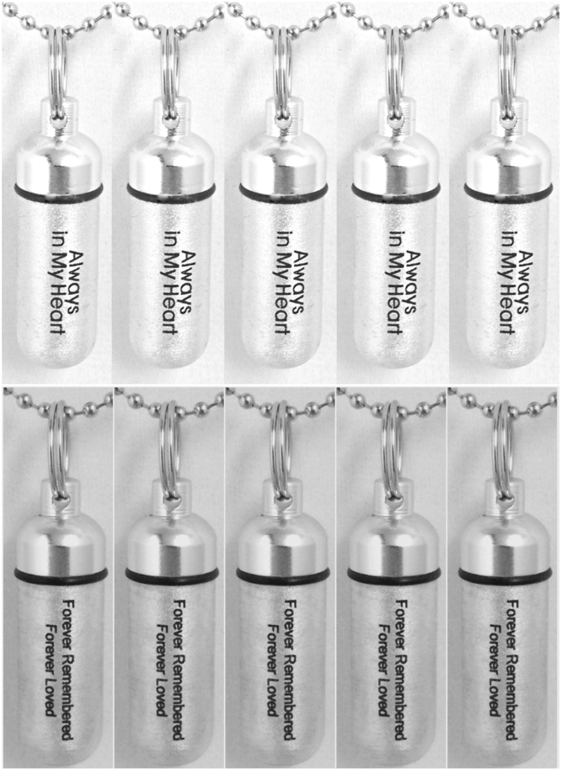 Set of 10 ENGRAVED Brushed Silver Cremation Urn Necklaces - FIVE "Forever Remembered, Forever Loved" & FIVE "Always In My Heart" w/Pouches