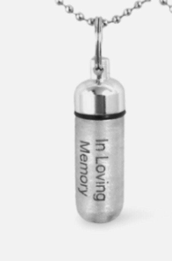Sturdy, discreet, and secure, this Urn is 1-3/4 inches tall and has a small clear container inside to hold a small amount of your loved ones ashes. Keep them close to you always. It is made of aircraft grade anodized aluminum, and will virtually last forever. The urn unscrews to reveal the storage chamber. Inside there is a clear container to keep the ashes safe and dry. A rubber gasket on the screw-on cap provides a waterproof seal. These urns are strong and lightweight enough to carry every day and fits nicely on a keyring or a necklace.