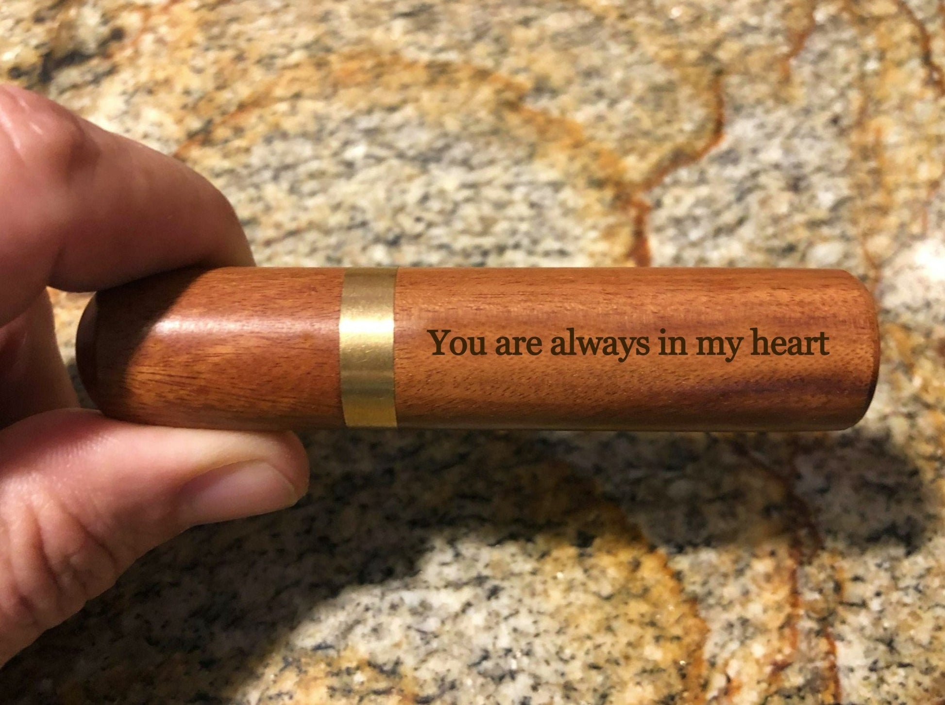 Sturdy, discreet, and secure, this Urn is 3-1/4 high and 5/8" wide. Made of natural Rosewood with brass fittings. A beautiful way to discreetly carry your loved one's ashes, or display the urn in a place of honor. Perfect for travel or for scattering a small amount of ashes in your loved one's favorite places. NOTE: Please be aware of local restrictions as to where & how to scatter ashes. Full instructions are included. These discreet urns/tubes are very secure and will virtually last forever. The urn unscrews to reveal the storage chamber which will keep a teaspoon of ash safe and dry. TSA COMPLIANT.