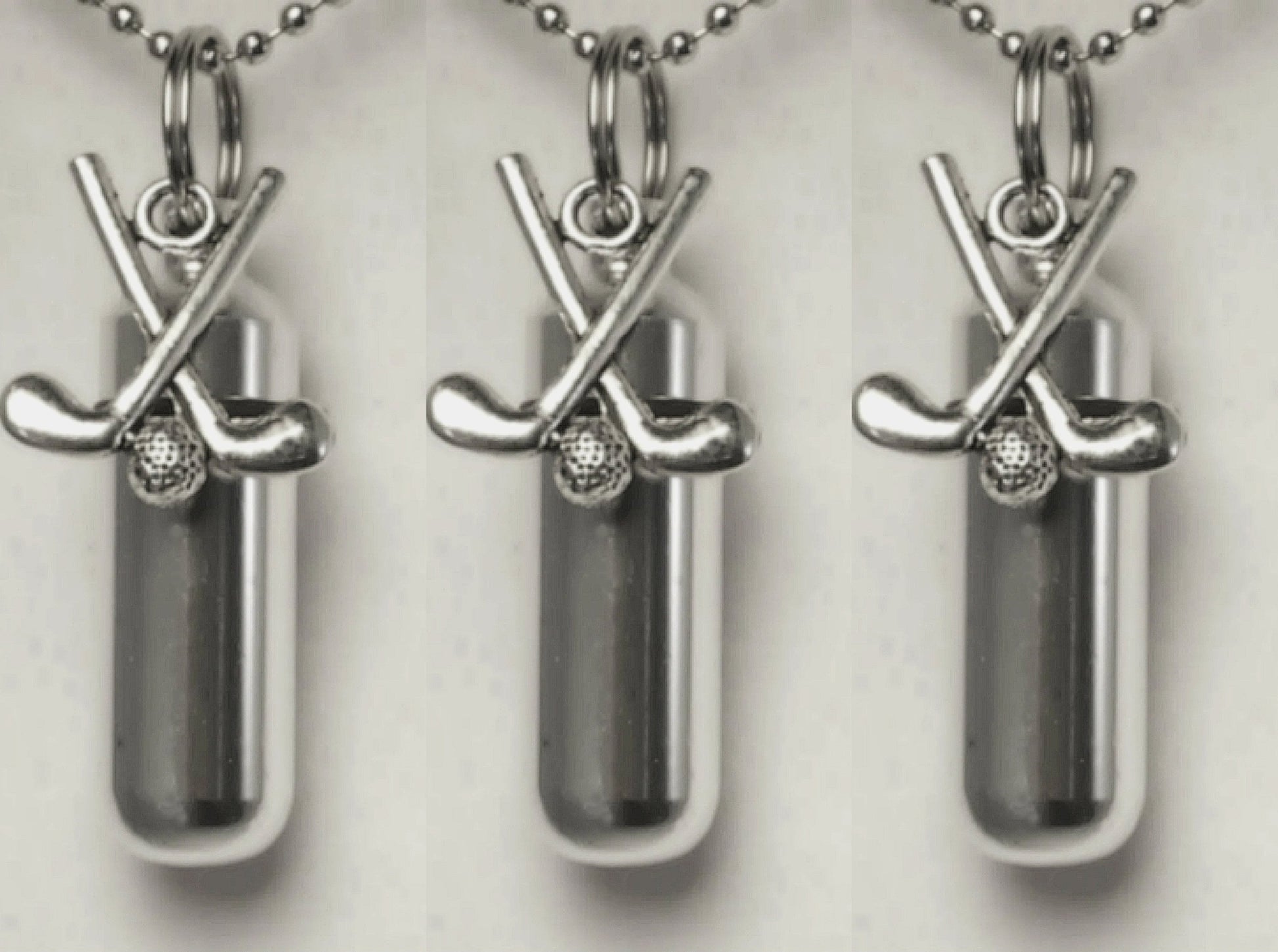 A wonderful & personal CREMATION URN memento & remembrance of a special loved one who was also a GOLF fan. Wear it everyday on the included 24" ball-chain, or hang it from a picture frame, a car mirror, or a keychain. Each Keepsake Urn includes an individual Black Velvet Pouch, 24" & Steel Ball-Chain Necklace