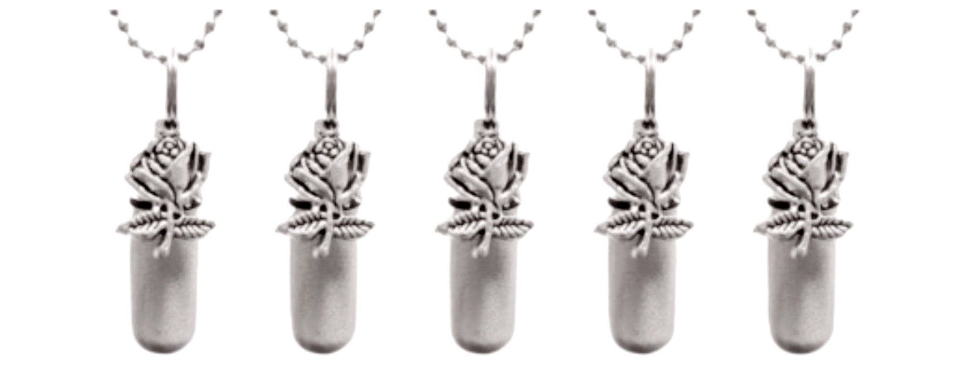 Set of 5 Brushed Silver ROSE ANOINTING OIL Holders with 5 Velvet Pouches, 5 Steel Ball-Chain Necklaces