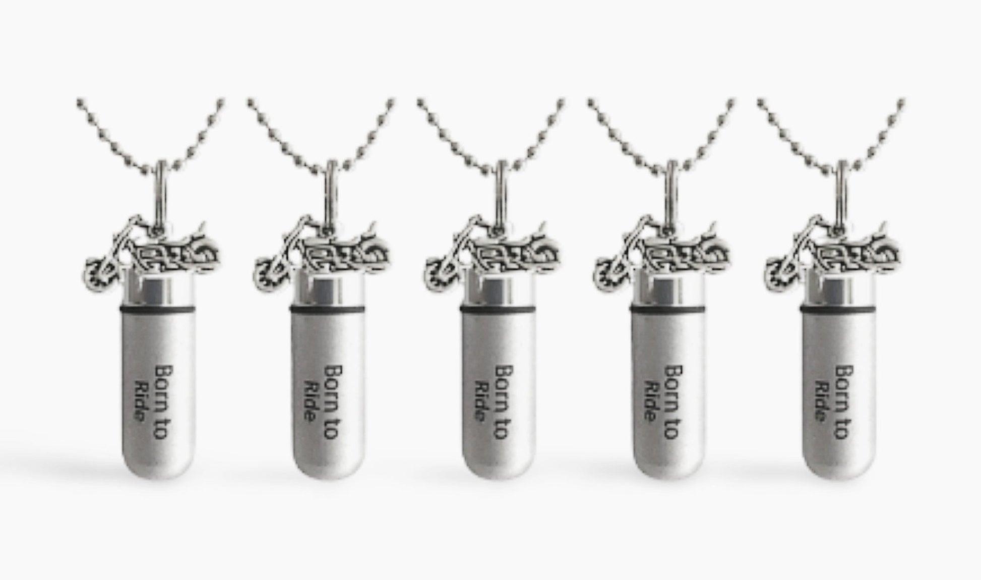 Set of 5 ENGRAVED Brushed Silver Cremation Urn Necklaces "Born To Ride" with Motorcycle - Memorial Jewelry, Urn For Human Ashes, Pet Urn