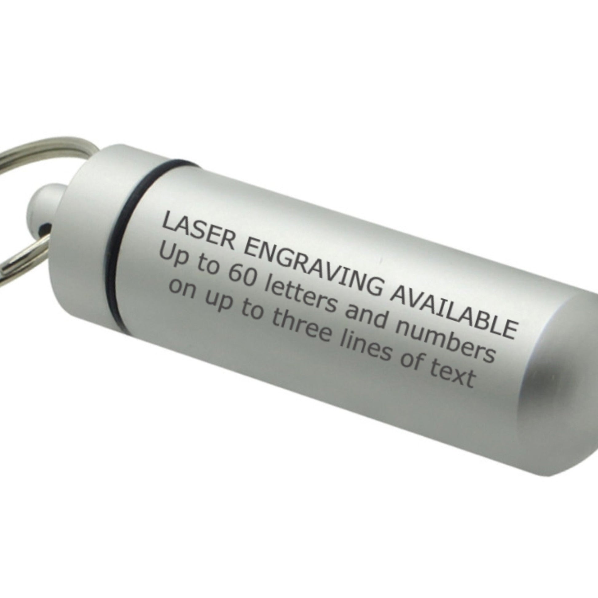 Sturdy, discreet, and secure, this Urn is 1-3/4 inches tall and has a small clear container inside to hold a small amount of your loved ones ashes. Keep them close to you always. It is made of aircraft grade anodized aluminum, and will virtually last forever. The urn unscrews to reveal the storage chamber. Inside there is a clear container to keep the ashes safe and dry. A rubber gasket on the screw-on cap provides a waterproof seal. These urns are strong and lightweight enough to carry every day and fits nicely on a keyring or a necklace.