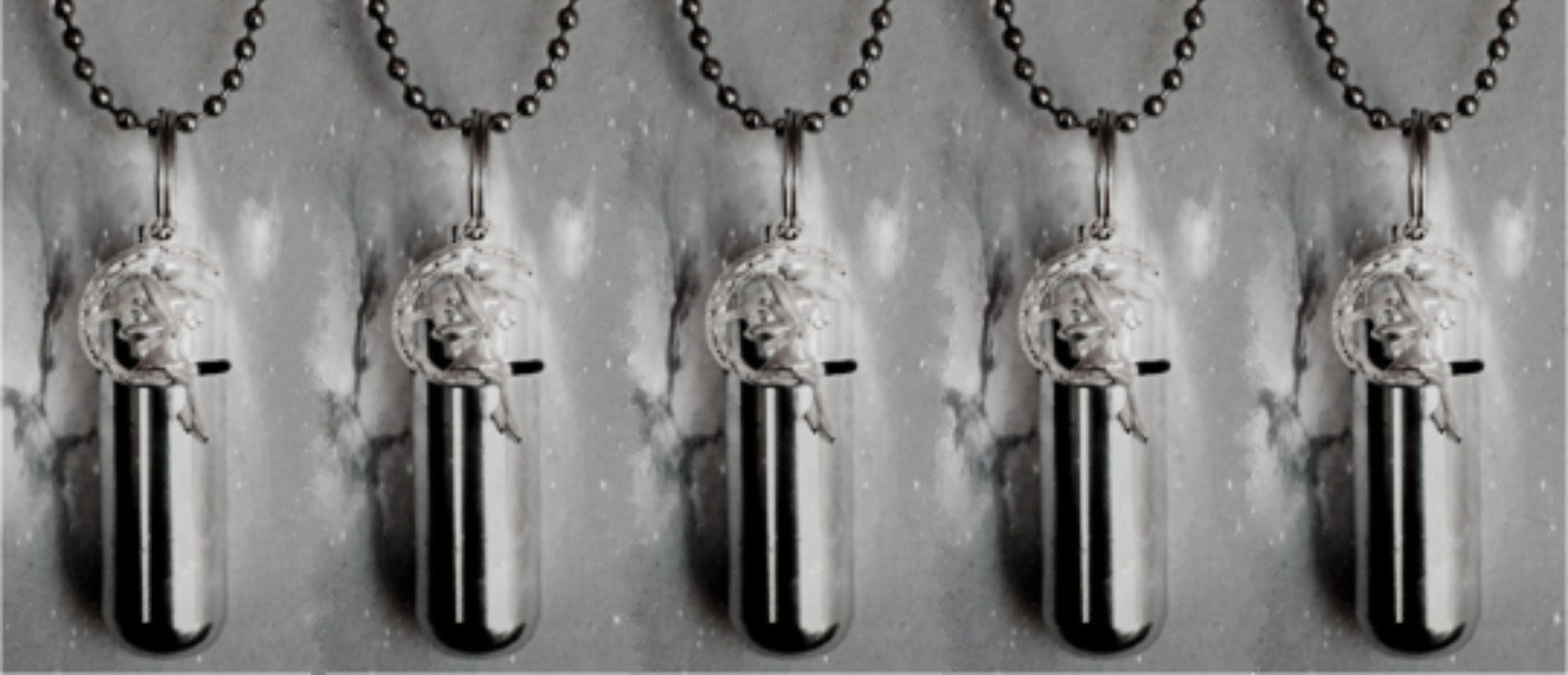 You get 5 Silver Cremation Urns & containers on 24" Ball Chain Necklaces with Angel on Moon