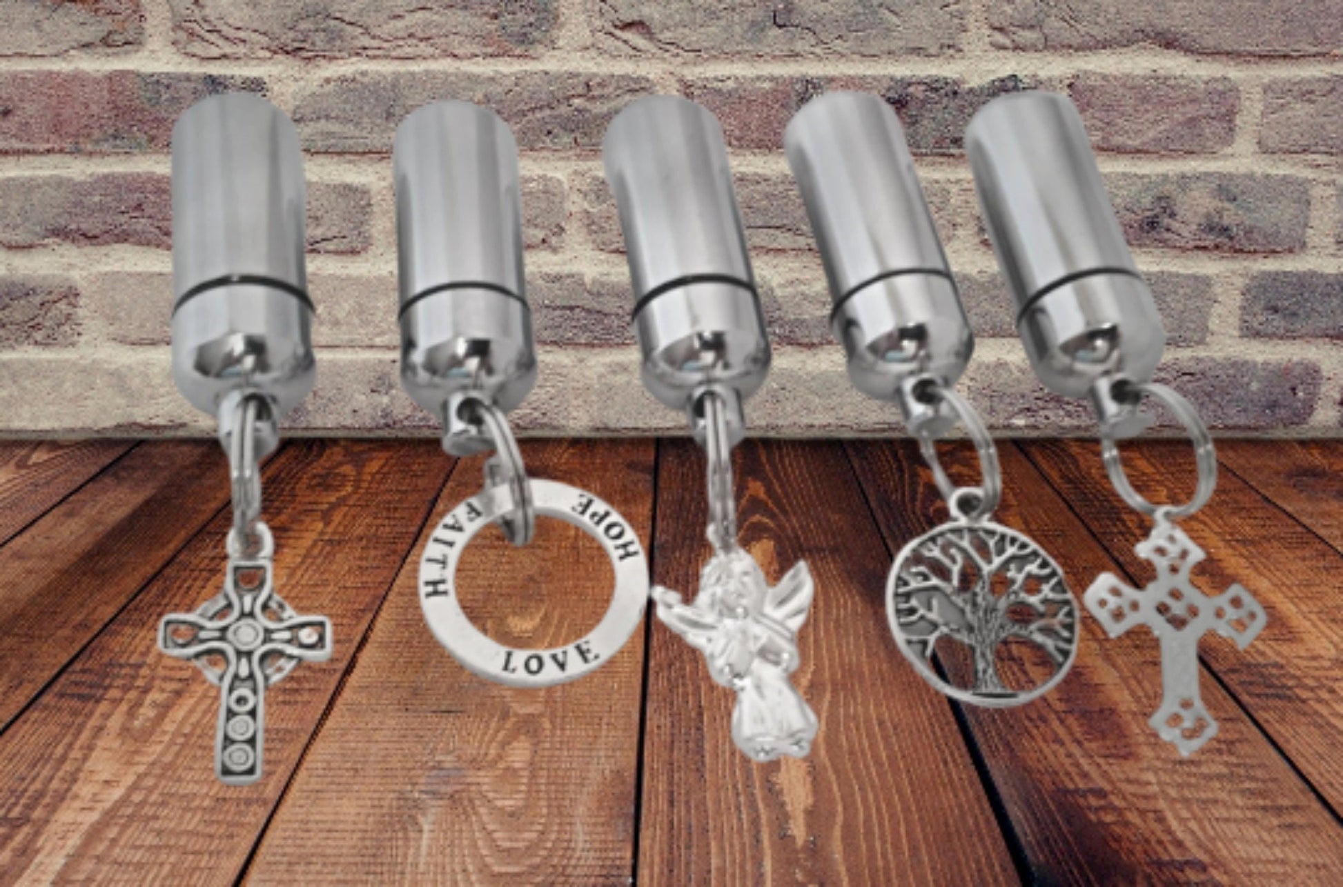 Sturdy, discreet, and secure, this Urn is 1-3/4 inches tall and has a small clear container inside to hold a small amount of your loved ones ashes. Keep them close to you always. Urn is made of aircraft-grade anodized aluminum and will last forever. The urn unscrews to reveal the storage chamber. Inside there is a clear container to keep the ashes safe and dry. A rubber gasket on the screw-on cap provides a waterproof seal. These urns are strong and lightweight enough to carry every day and fits nicely on a key ring or a necklace.