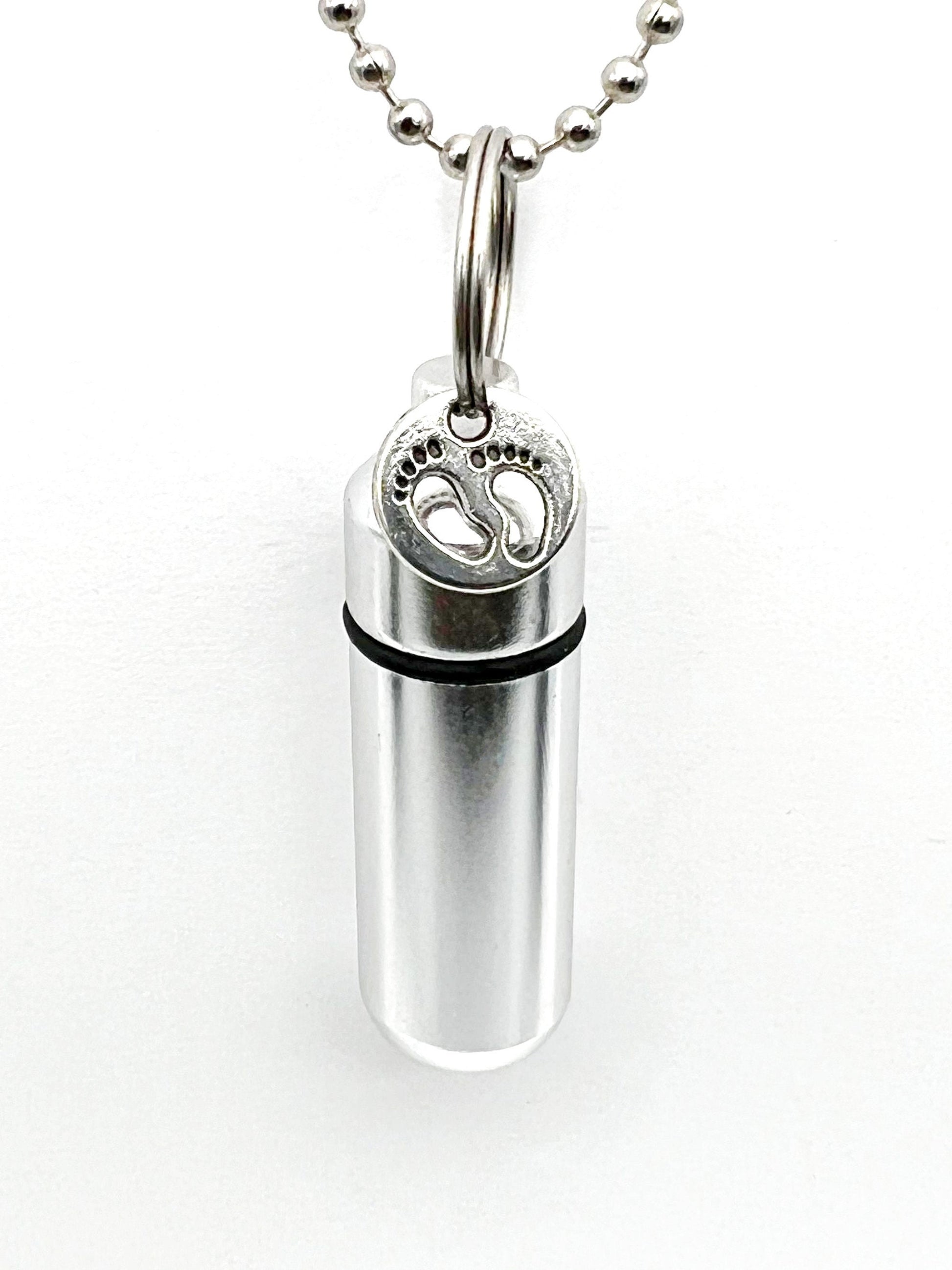 NECKLACE / PENDANT / LOCKET Sturdy, discreet, and secure, this Urn is 1-3/4 inches tall and has a small clear container inside to hold a small amount of your loved ones ashes. Keep them close to you always. It is made of aircraft grade anodized aluminum, and will virtually last forever. The urn unscrews to reveal the storage chamber. Inside there is a clear container to keep the ashes safe and dry. A rubber gasket on the screw-on cap provides a waterproof seal. These urns are strong and lightweight enough to carry every day and fits nicely on a keyring or a necklace.
