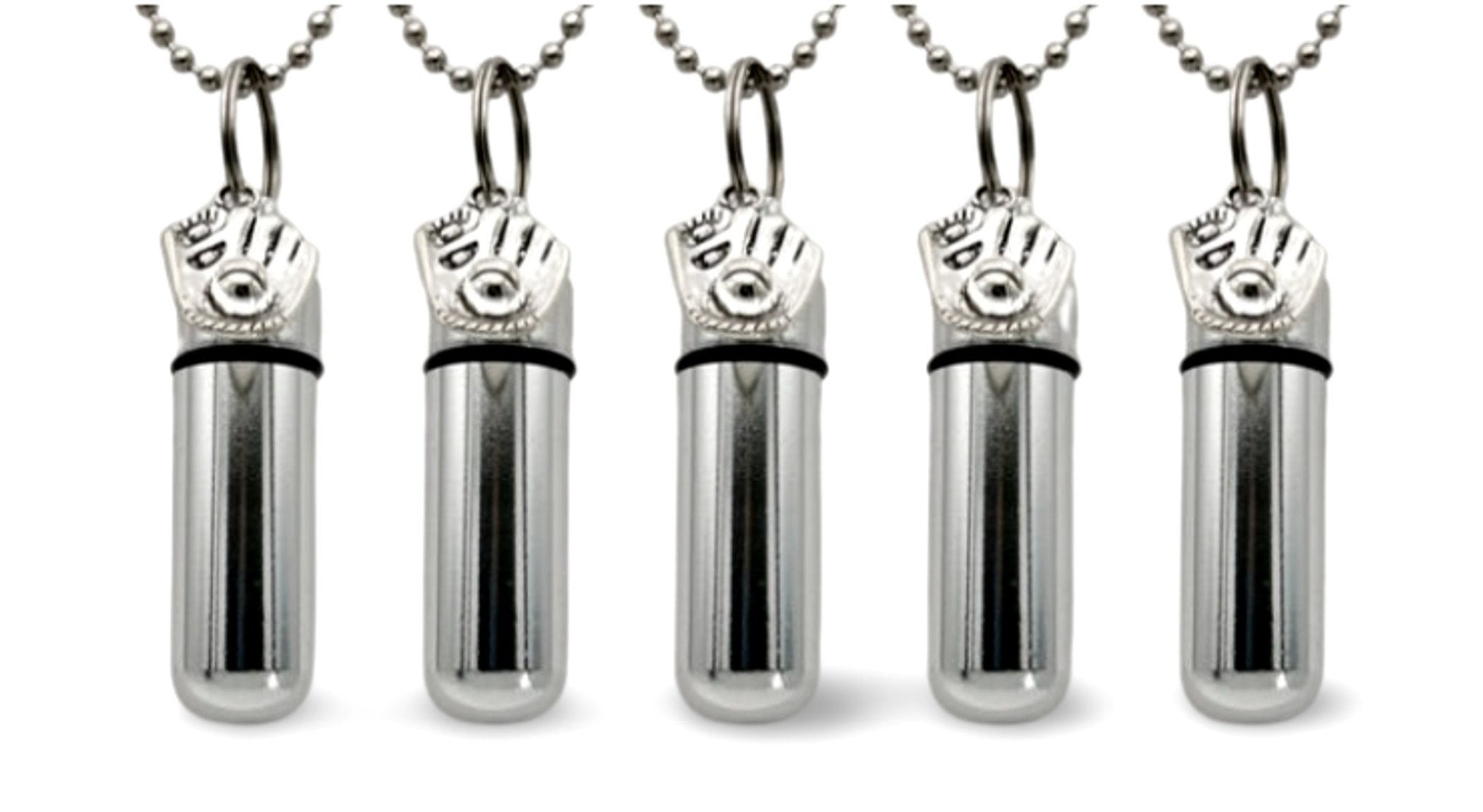 YOU GET FIVE BASEBALL GLOVE CREMATION URN KEEPSAKES, FIVE VELVET POUCHES, A FILL KIT, and FIVE Steel 24" BALL CHAINS.