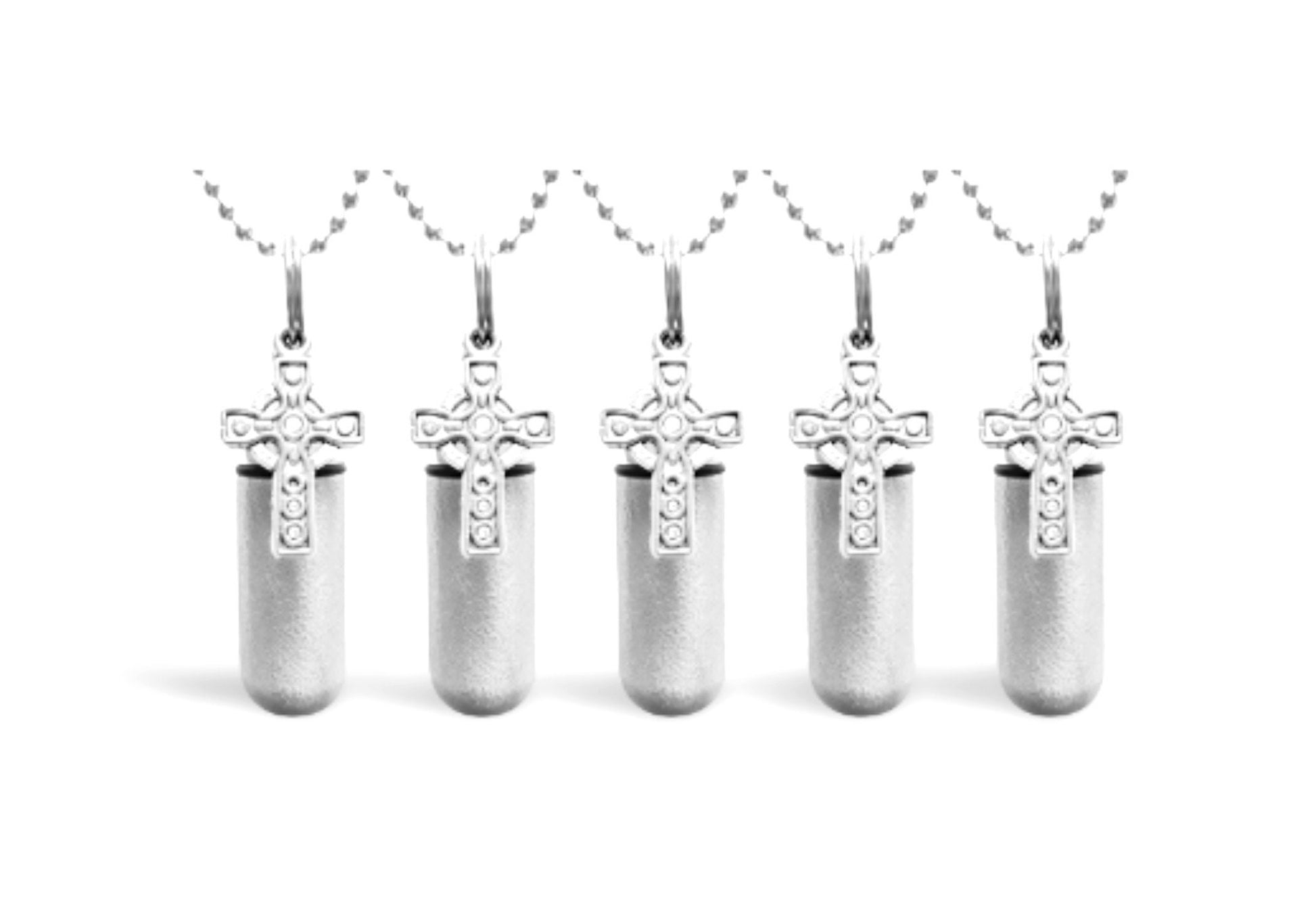 Set of FIVE Brushed Silver Celtic Cross Anointing Oil Holders / containers - Includes 5 Velvet Pouches, 5 Ball Chain Necklaces, 5 fill kit