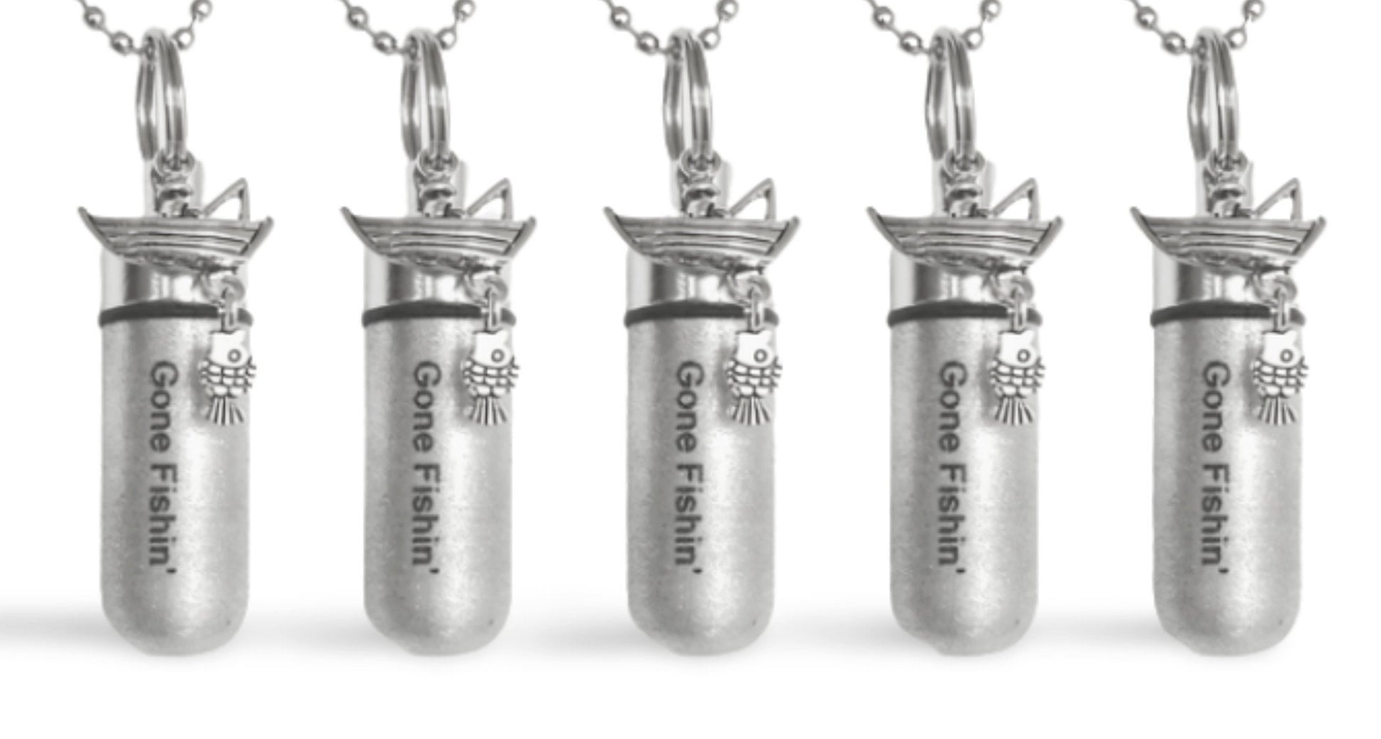 YOU GET FIVE "Gone Fishin" CREMATION URN KEYCHAIN NECKLACE KEEPSAKES, WITH FIVE VELVET POUCHES, FILL KIT, AND FIVE 24" STEEL BALL CHAINS.