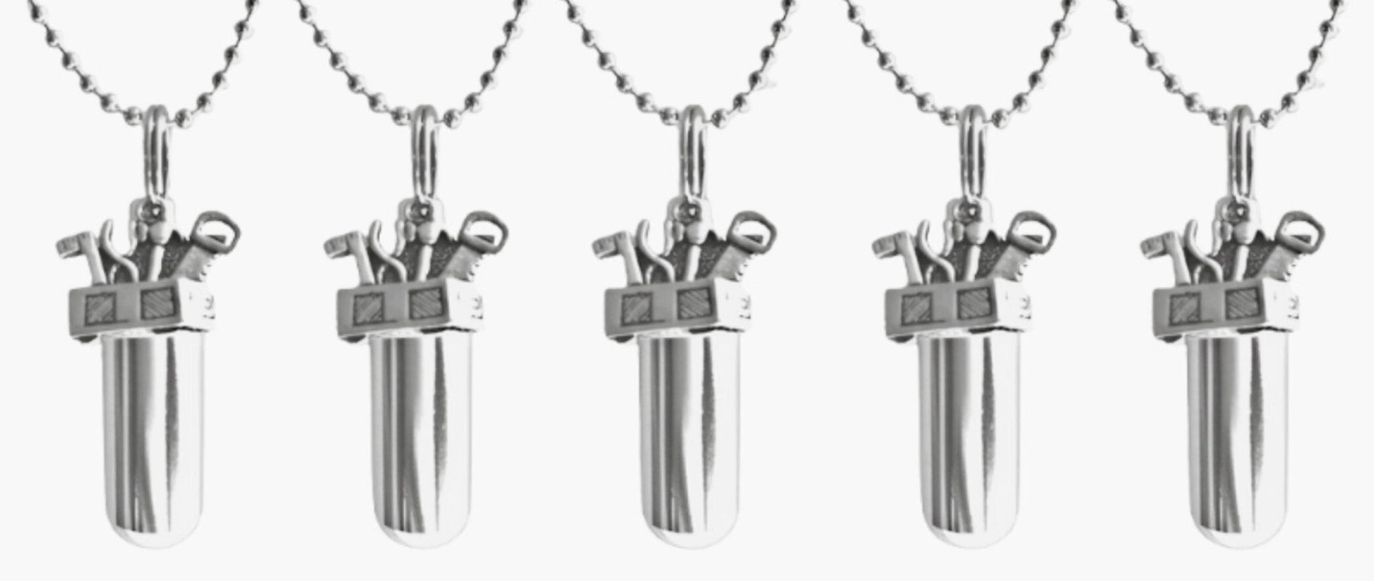 Set of Five CREMATION TOOLBOX Urn Necklaces for Contractor/Mechanic/Handyman (with 5 Tool Box Charms) Memorial Jewelry, Urn For Human Ashes